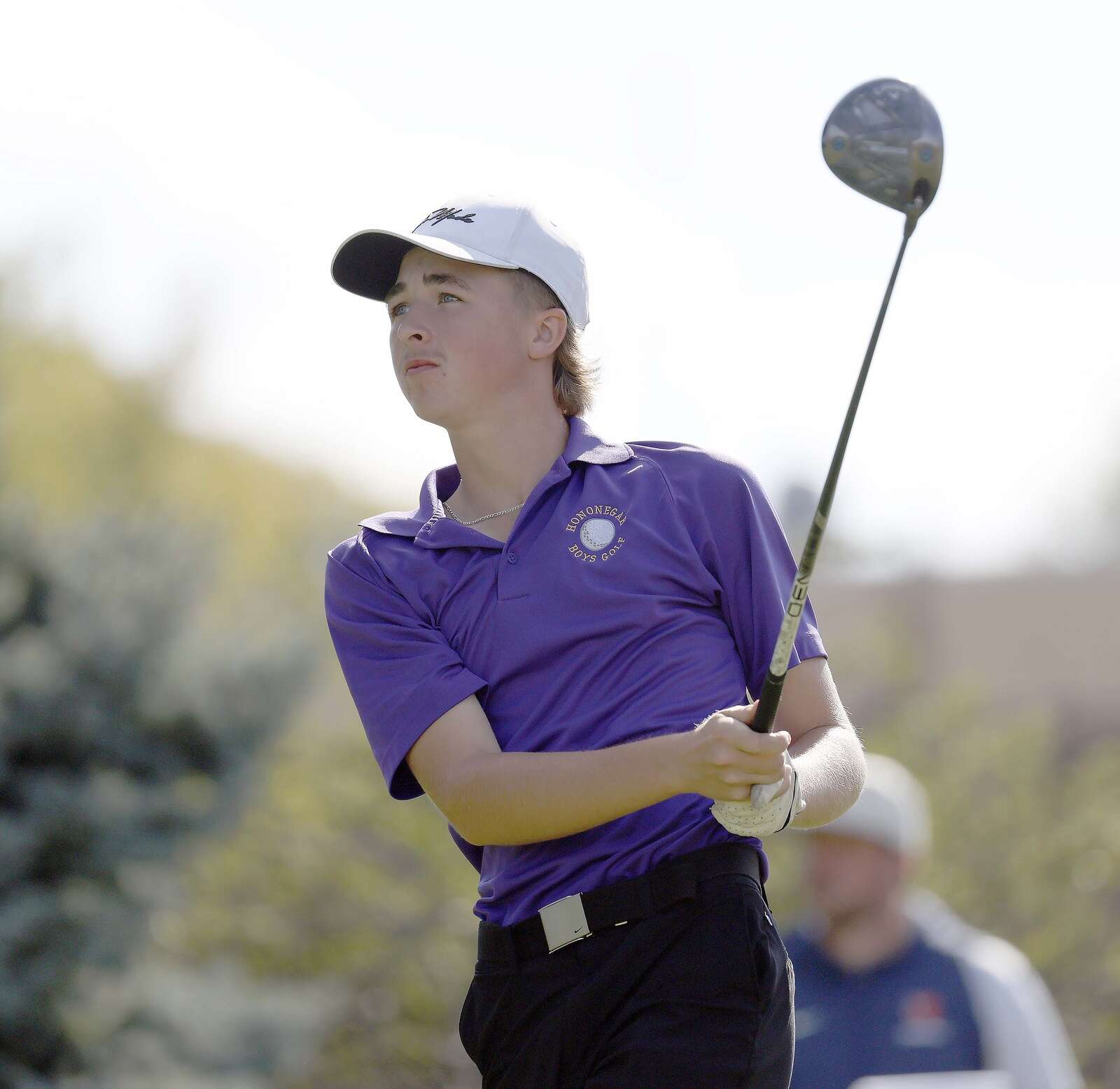 Rory Ruper of Hononegah watches his tee shot during the Class 3A boys golf sectional Monday, Oct. 6, 2025 at the Buffalo Grove Golf Club in Buffalo Grove. Brian Hill/bhill@dailyherald.com