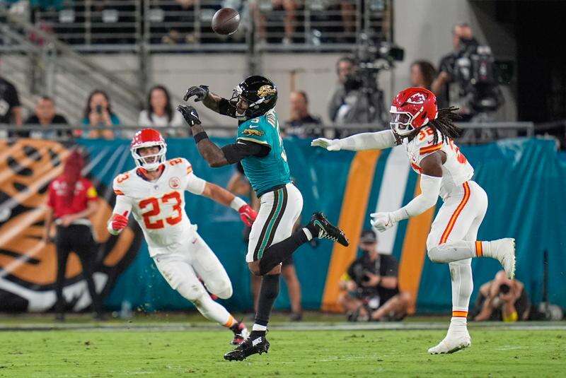 He juked Mahomes and Hunt, then got up to full speed along the Jaguars’ sideline. He picked up a block from Josh Hines-Allen and then held the ball tight as Tyquan Thornton tried to knock it loose at the 5-yard line.