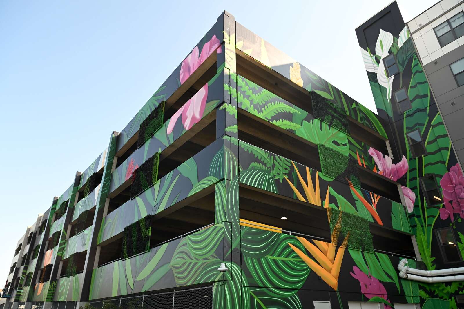 Rockford artist Brett Whitacre painted a mural on the side of the Uptown 500 complex’s parking garage in 2024. Joe Lewnard/jlewnard@dailyherald.com, 2024
