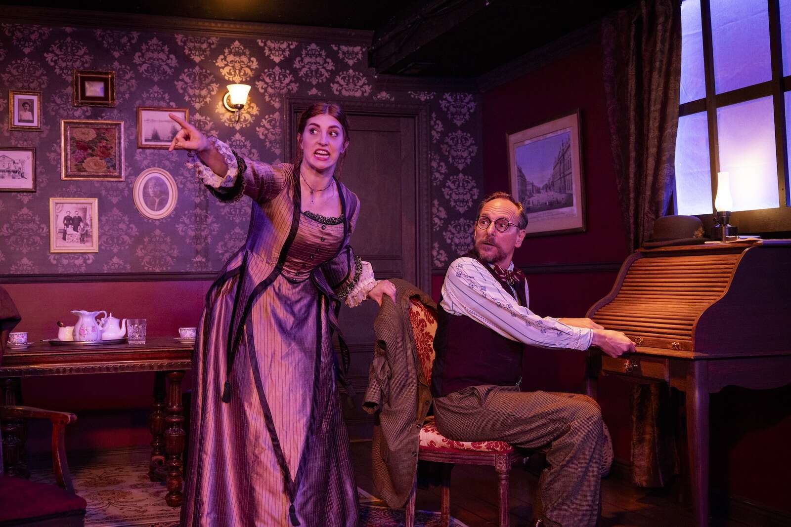 Moments into the play, which unfolds in late 19th-century London in the Manningham family home, husband Jack (Sam Fain) naps as his fretful wife, Bella (Megan Kueter), attempts to purchase muffins from a street vendor. Her husband, having only feigned sleep, speaks up.