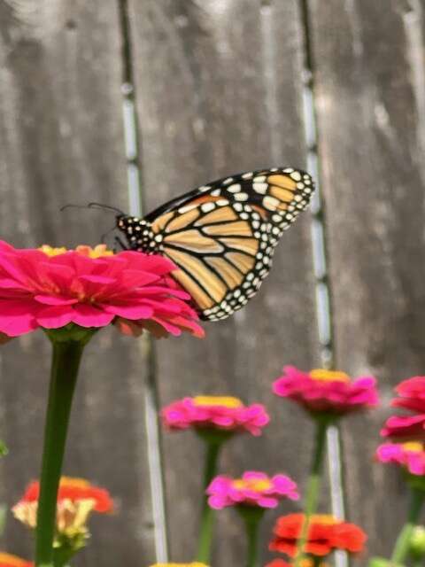 FOURTH PLACE: A monarch butterfly is perched on a bright red zinnia. Marianne Perez of Elgin