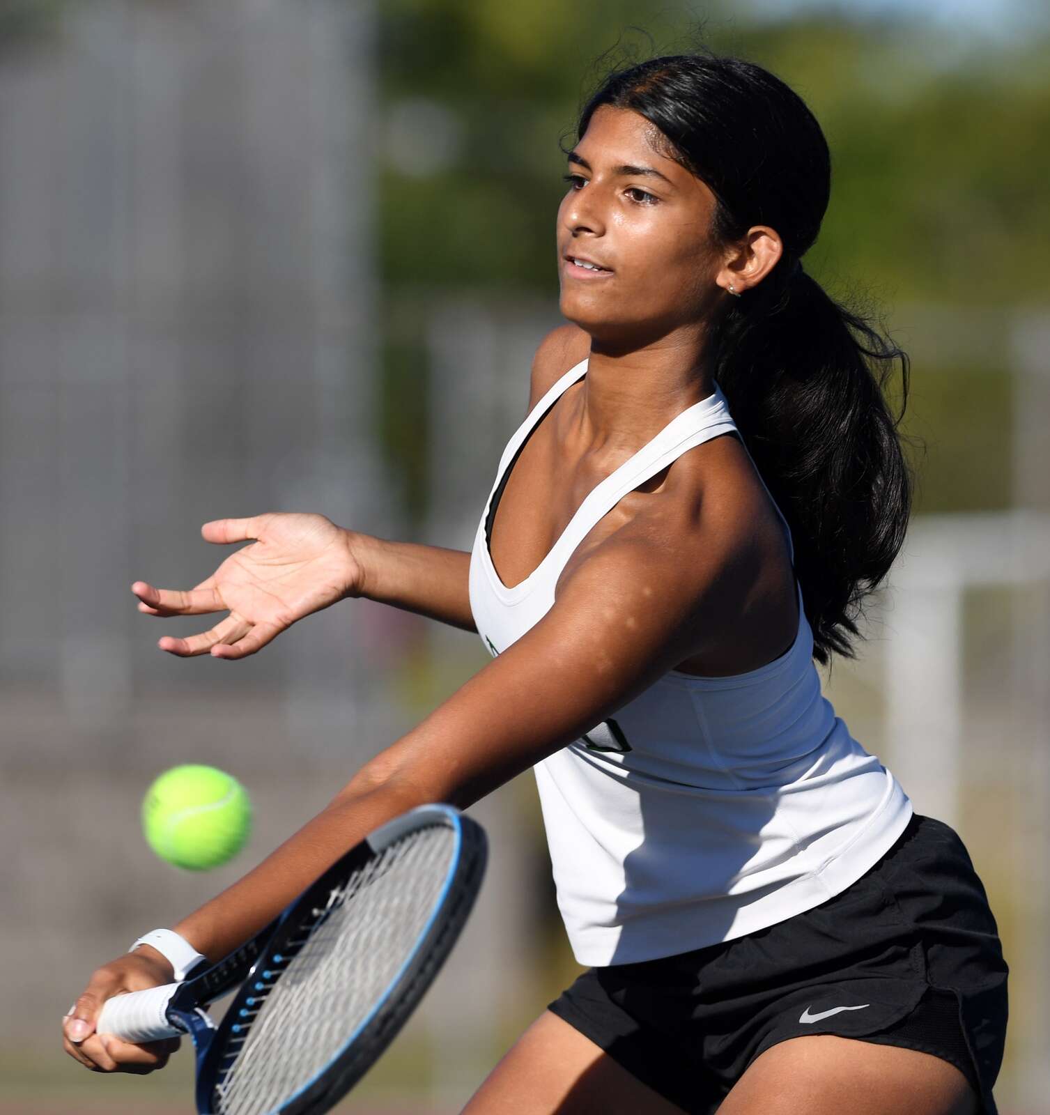 Barrington’s Shriya Ramesh returns the ball while competing in the first singles final during the MSL girls tennis tournament at Conant High School on Saturday, Oct. 11, 2025 in Hoffman Estates.