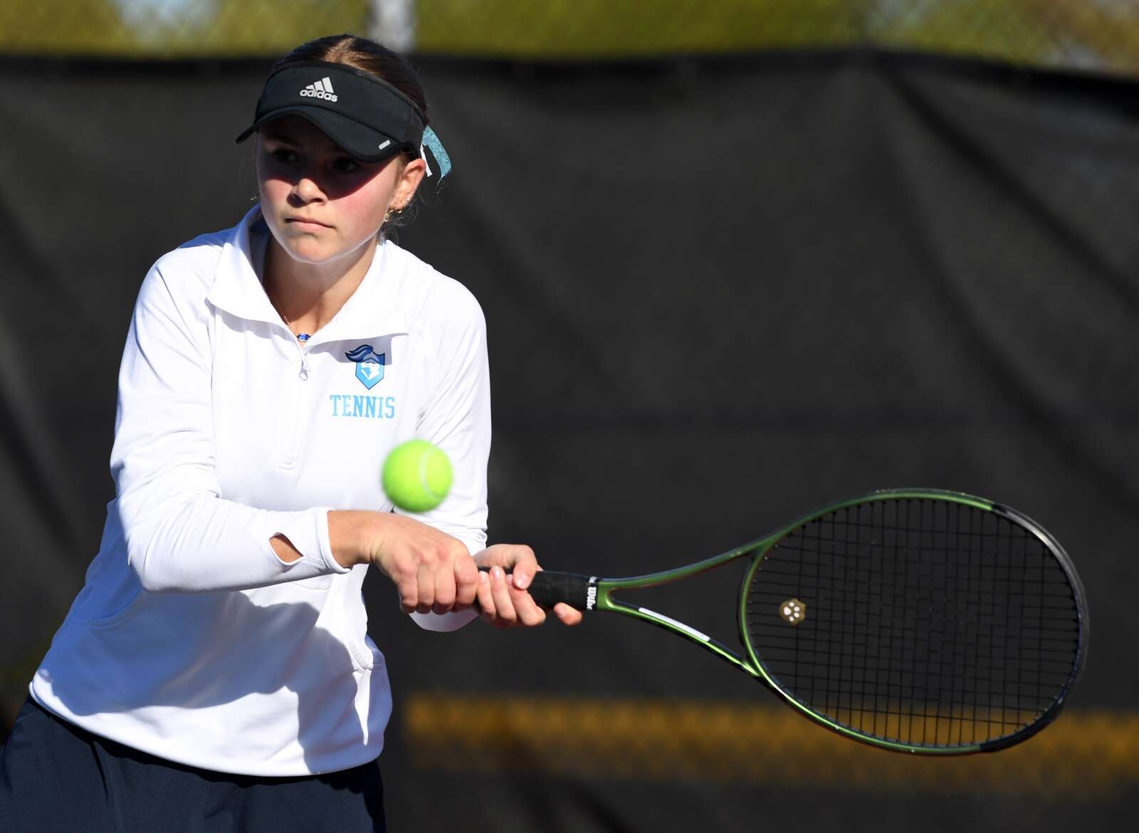 Conant first singles player Khrystyna Pivtorak returns the ball during the semifinals of the MSL girls tennis tournament at Conant High School on Saturday, Oct. 11, 2025 in Hoffman Estates.