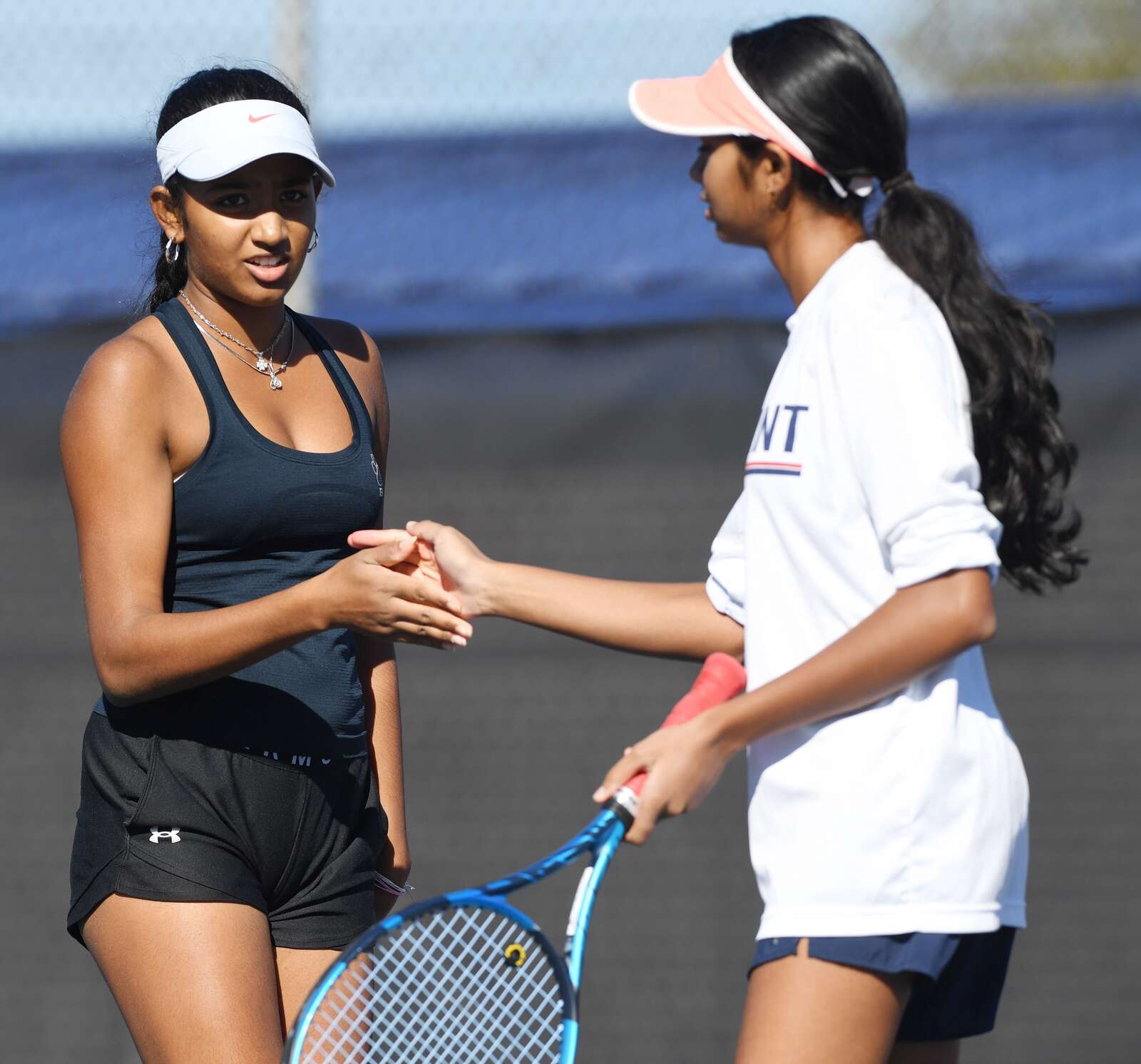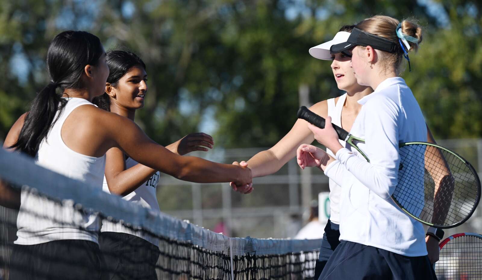 Left to right, Fremd doubles players Stella Lee and Siya Mistry shake hands with Prospect’s Riley Phillips and Casey Brosnan at the conclusion of their first doubles semifinal, which was won by Fremd, during the MSL girls tennis tournament at Conant High School on Saturday, Oct. 11, 2025 in Hoffman Estates.
