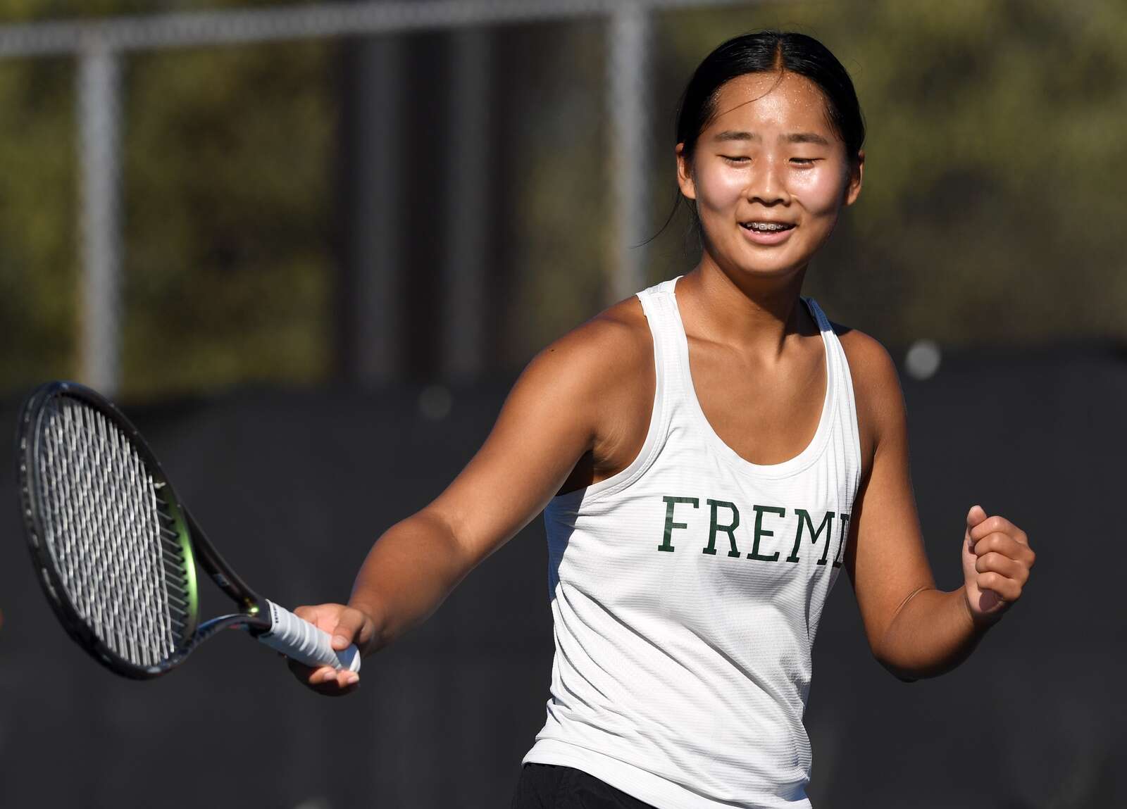 Fremd first doubles player Stella Lee celebrates after she and partner Siya Mistry earned a point in their semifinal match against Prospect during the MSL girls tennis tournament at Conant High School on Saturday, Oct. 11, 2025 in Hoffman Estates.