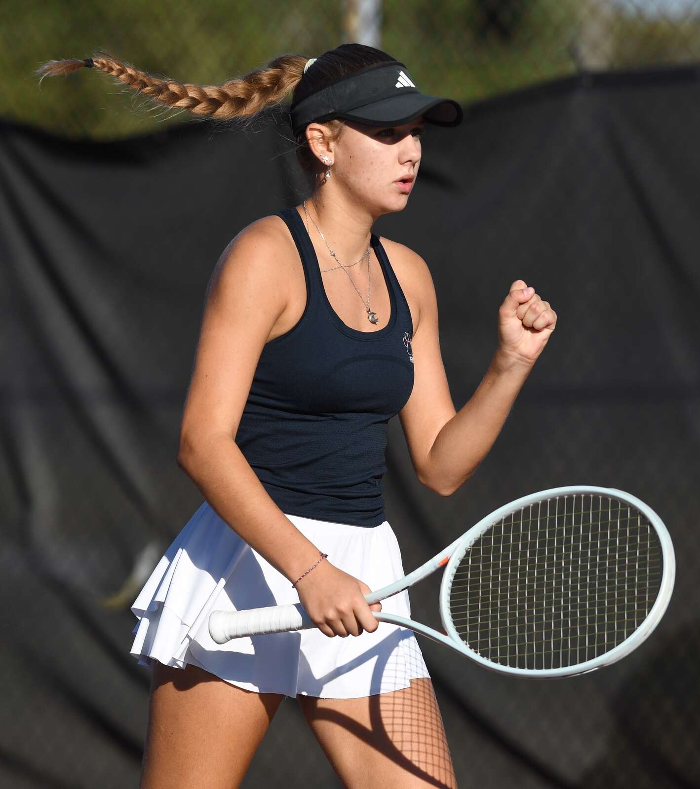 Conant first singles player Khrystyna Pivtorak pumps her fist after earning a point against Rolling Meadows’ Maddie Hrtanek the semifinals of the MSL girls tennis tournament at Conant High School on Saturday, Oct. 11, 2025 in Hoffman Estates.