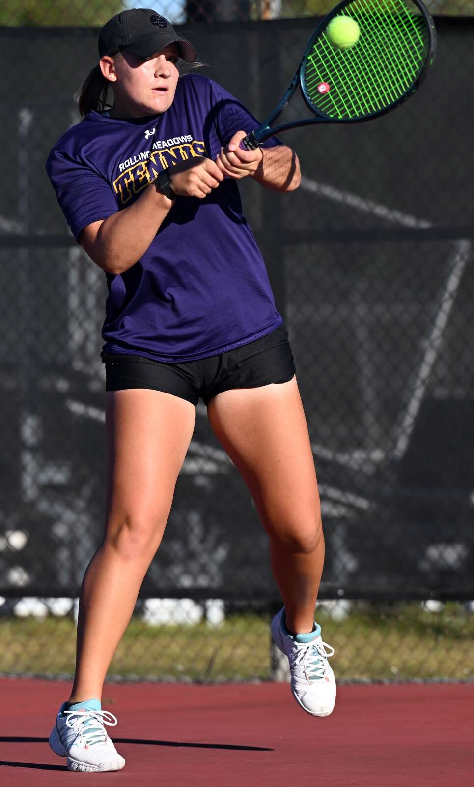 Rolling Meadows first singles player Maddie Hrtanek reaches high for the ball during semifinal the MSL girls tennis tournament at Conant High School on Saturday, Oct. 11, 2025 in Hoffman Estates.