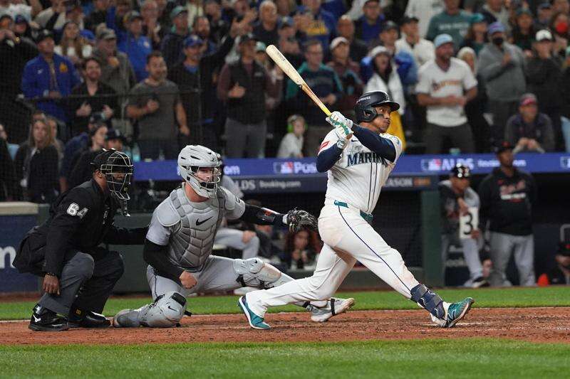 Seattle Mariners second baseman Jorge Polanco (7) hits an RBI-single for shortstop J.P. Crawford to score the game-winning run during the 15th inning in Game 5 of baseball's American League Division Series against the Detroit Tigers, Friday, Oct. 10, 2025, in Seattle. (AP Photo/Lindsey Wasson) (AP Photo/Lindsey Wasson)