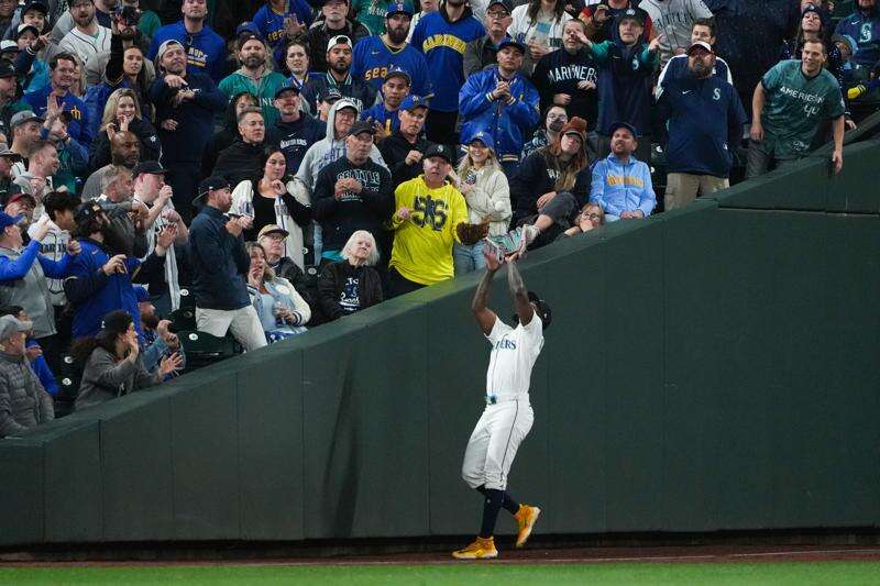 Seattle Mariners left fielder Randy Arozarena catches a fly ball hit by Detroit Tigers left fielder Riley Greene to take it to the bottom of the 15th inning in Game 5 of baseball's American League Division Series Friday, Oct. 10, 2025, in Seattle. (AP Photo/Lindsey Wasson) (AP Photo/Lindsey Wasson)
