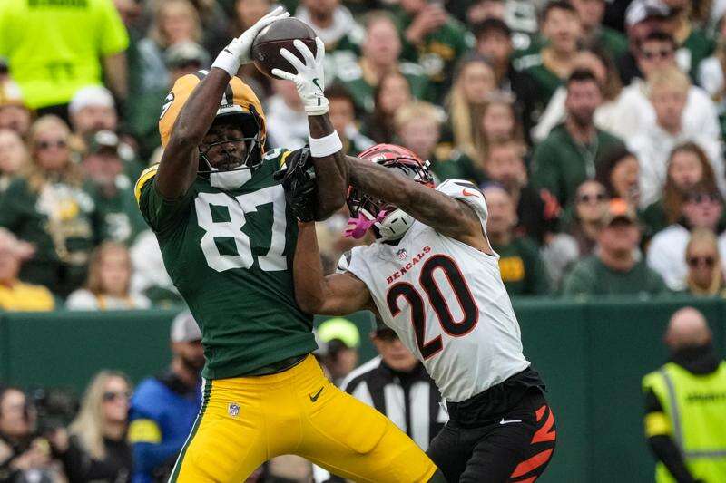 Green Bay Packers wide receiver Romeo Doubs (87) works for a catch against Cincinnati Bengals cornerback DJ Turner II (20) in the first half of an NFL football game, Sunday, Oct. 12, 2025, in Green Bay, Wis. (AP Photo/Morry Gash) AP