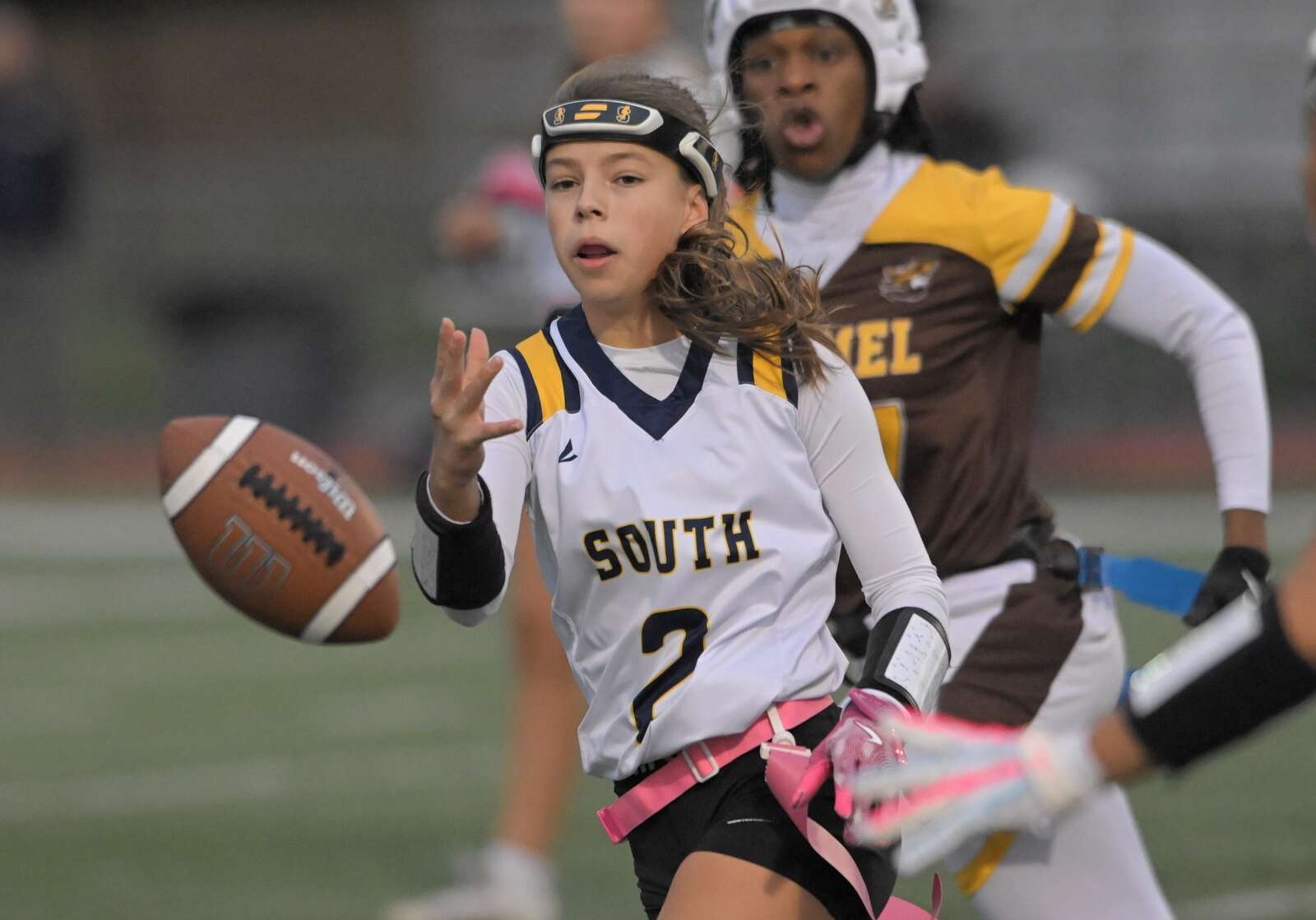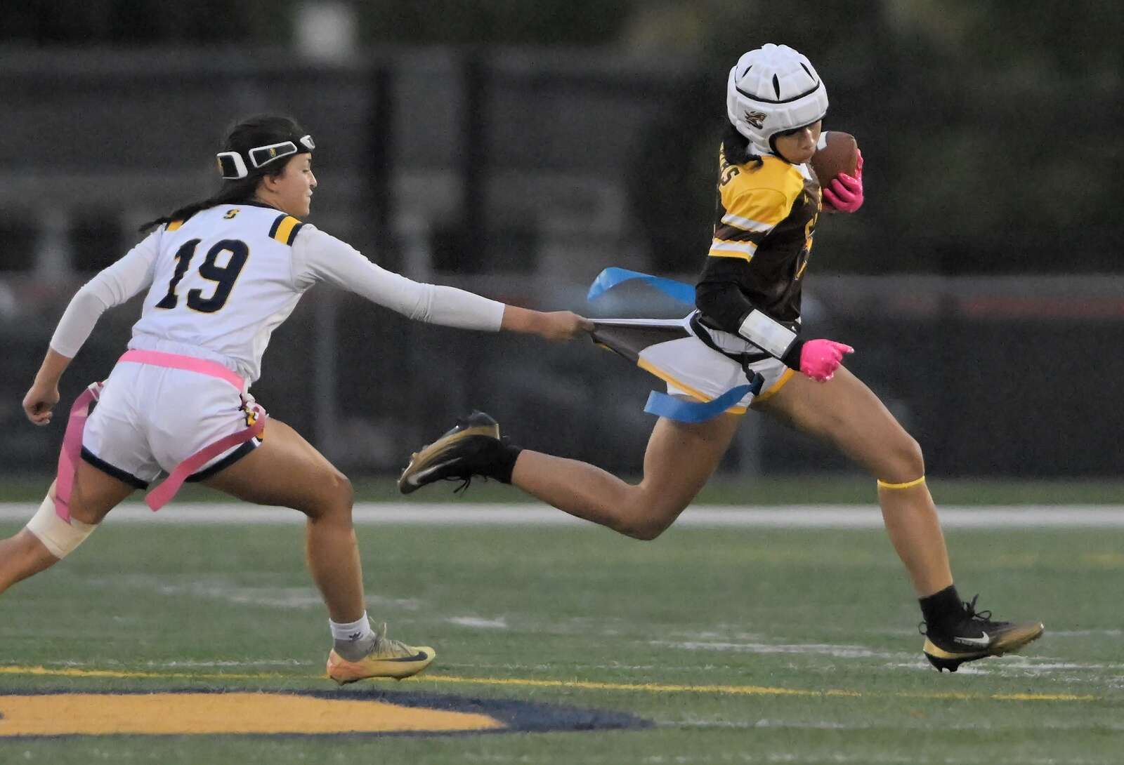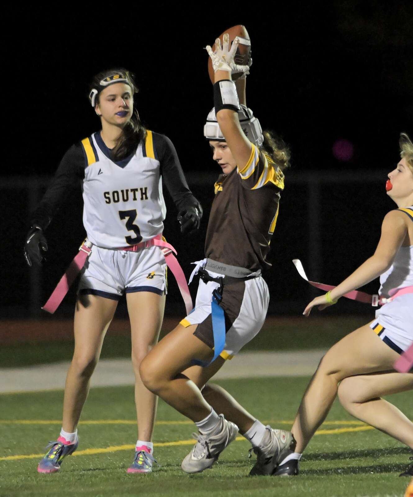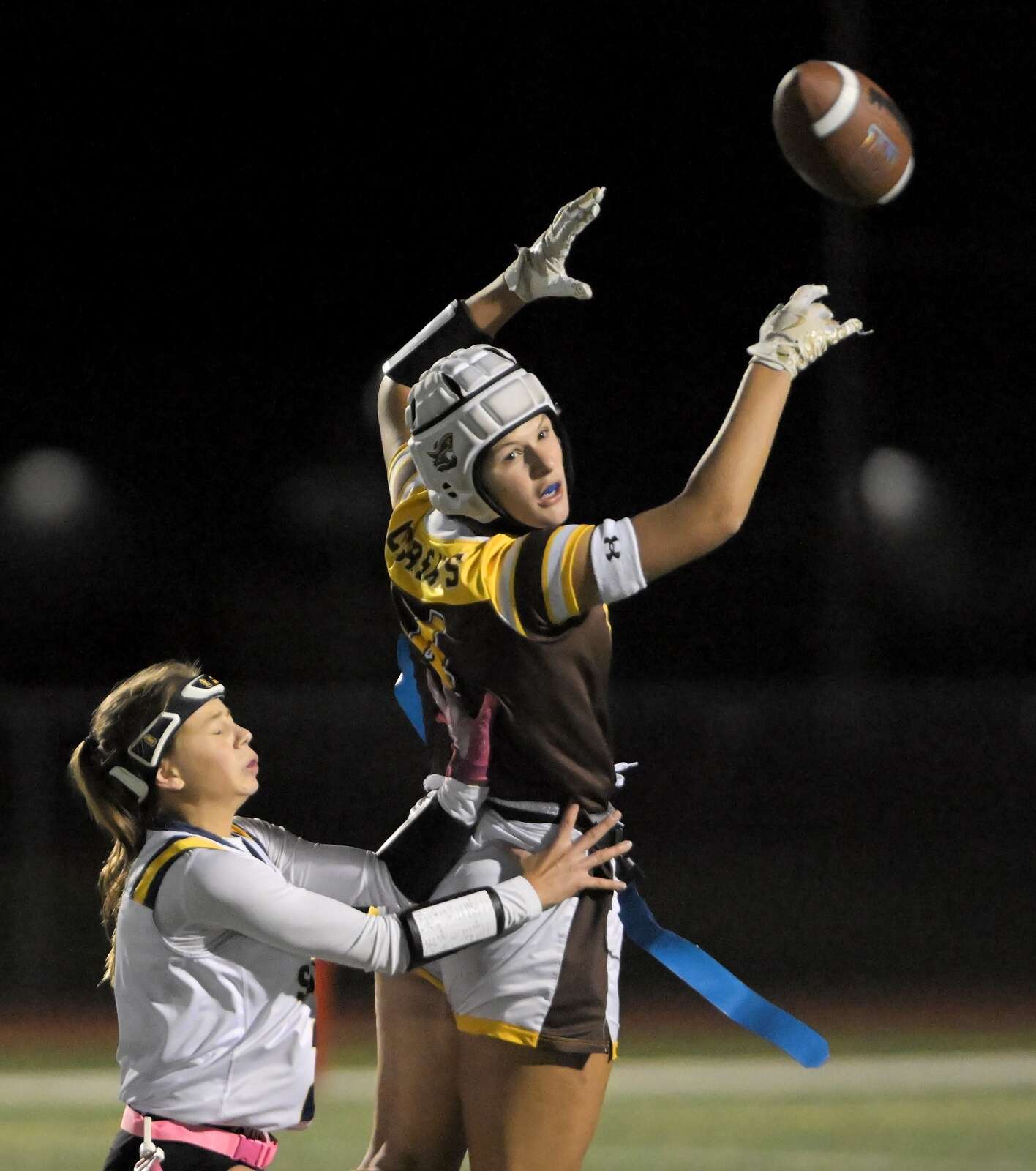 Glenbrook South’s Cooper Godbout catches a long pass as Carmel’s Josie Hartman defends in the IHSA Class 3A girls flag football sectional championship game at Buffalo Grove High School on Tuesday, Oct. 14, 2025.