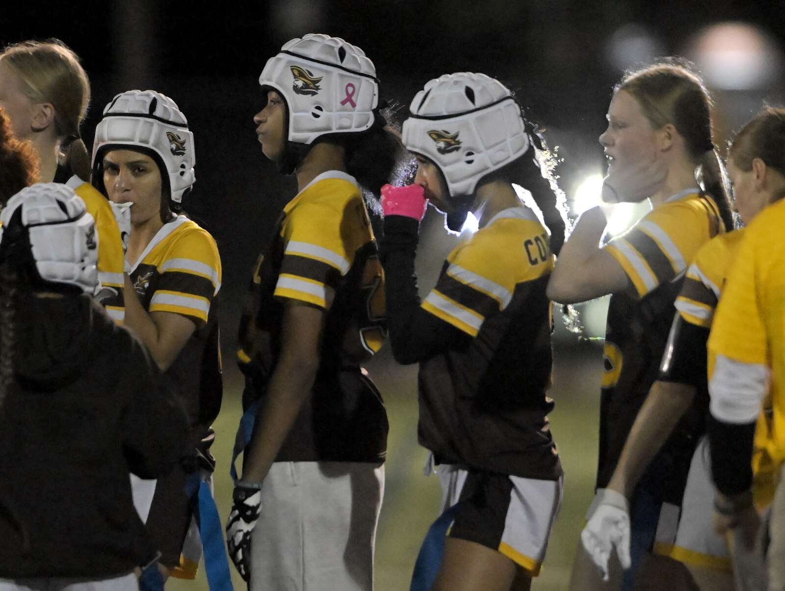 Carmel reacts to their loss to Glenbrook South in the IHSA Class 3A girls flag football sectional championship game at Buffalo Grove High School on Tuesday, Oct. 14, 2025.