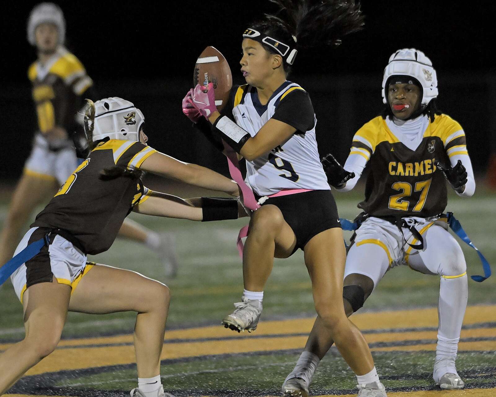 Carmel’s Grace Booher and Ayomide Akingbesote, right, defend as Glenbrook South’s Selah Cho catches a pass in the IHSA Class 3A girls flag football sectional championship game at Buffalo Grove High School on Tuesday, Oct. 14, 2025.