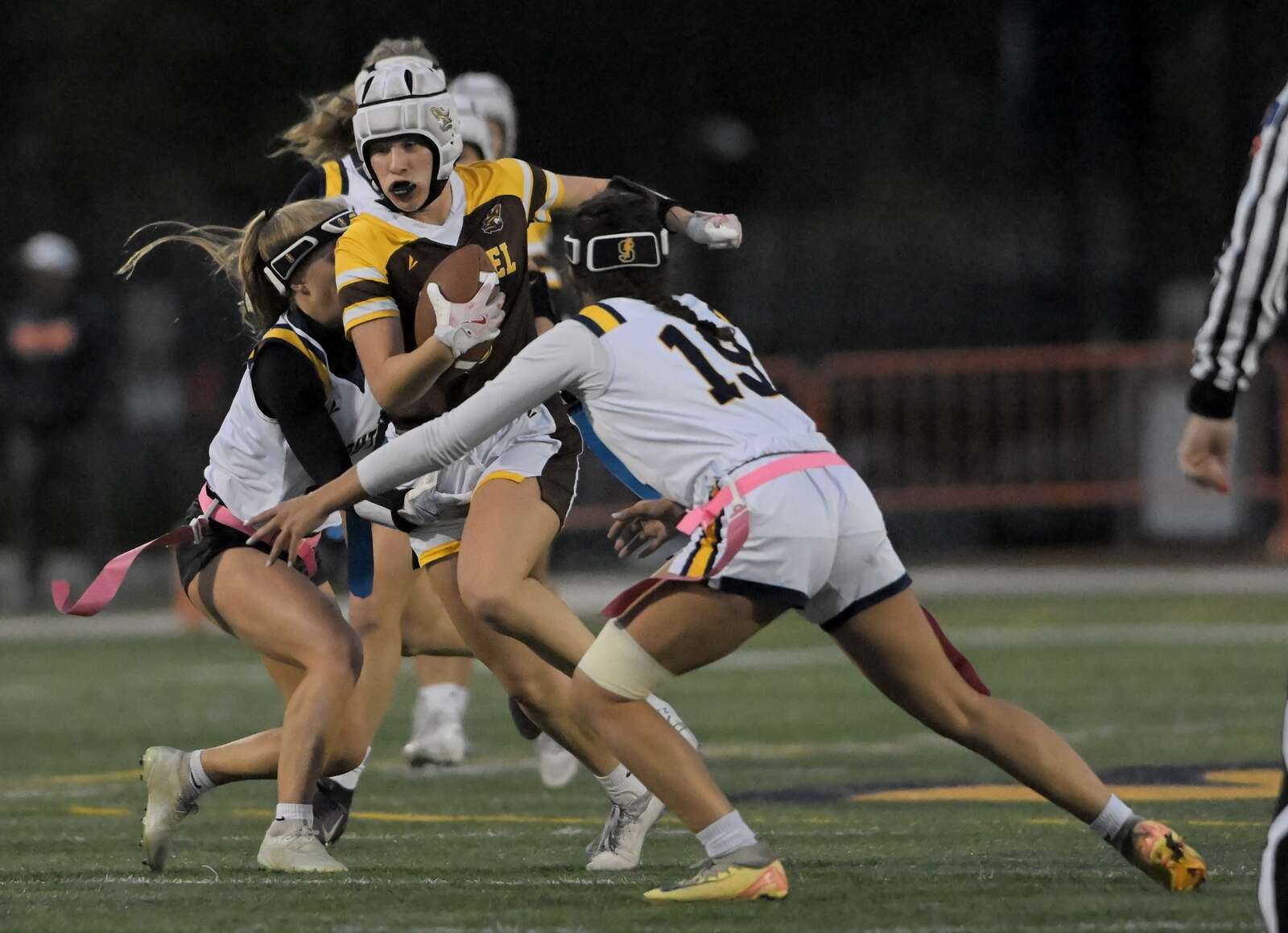 Carmel’s Grace Booher cuts between Glenbrook South players in the IHSA Class 3A girls flag football sectional championship game at Buffalo Grove High School on Tuesday, Oct. 14, 2025.