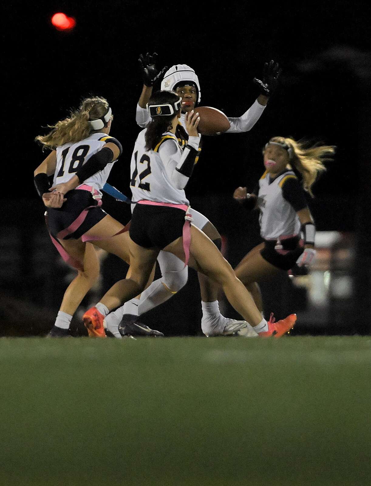 Carmel’s Colleen Graham catches a touchdown pass as time expires in the IHSA Class 3A girls flag football sectional championship game loss to Glenbrook South at Buffalo Grove High School on Tuesday, Oct. 14, 2025.