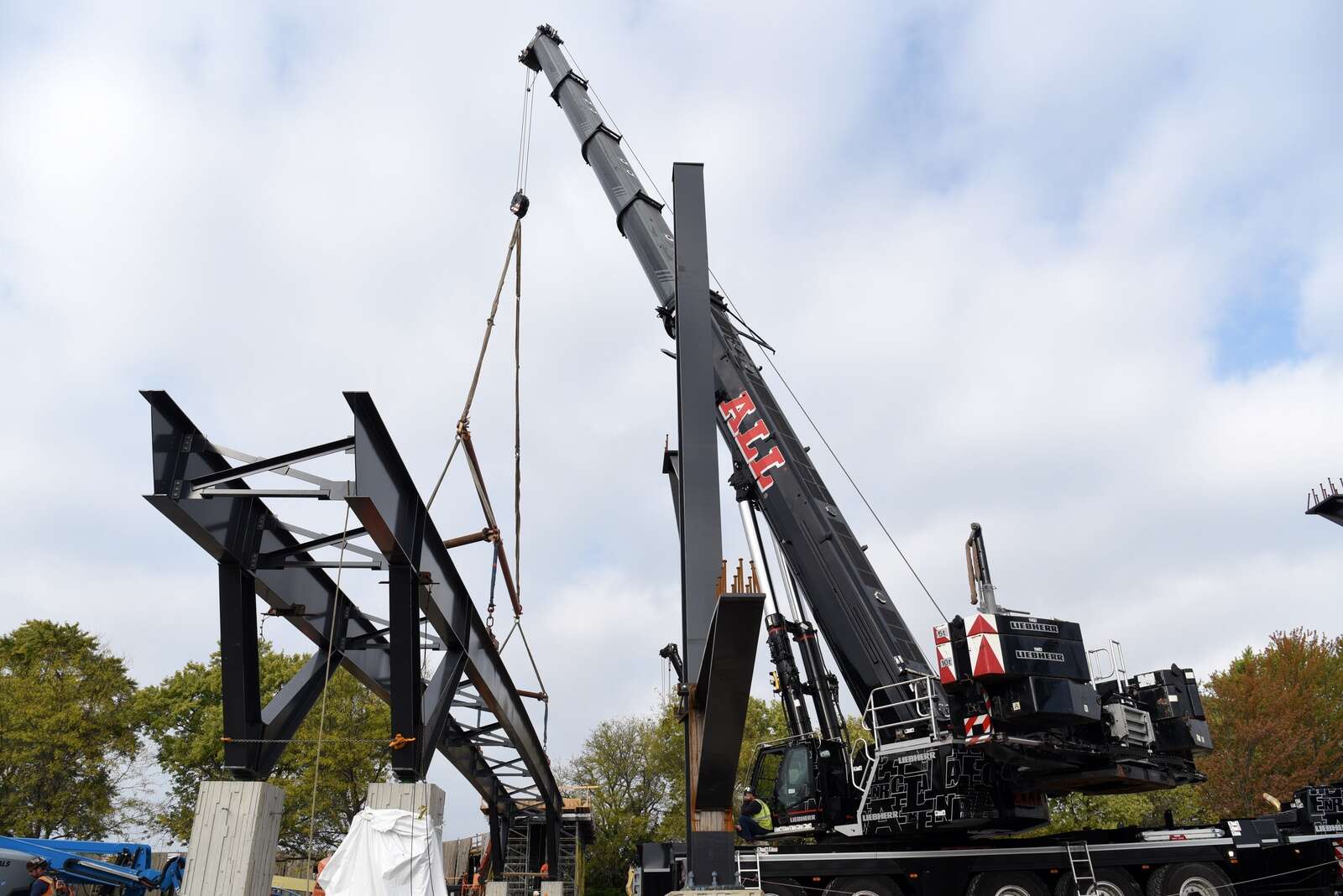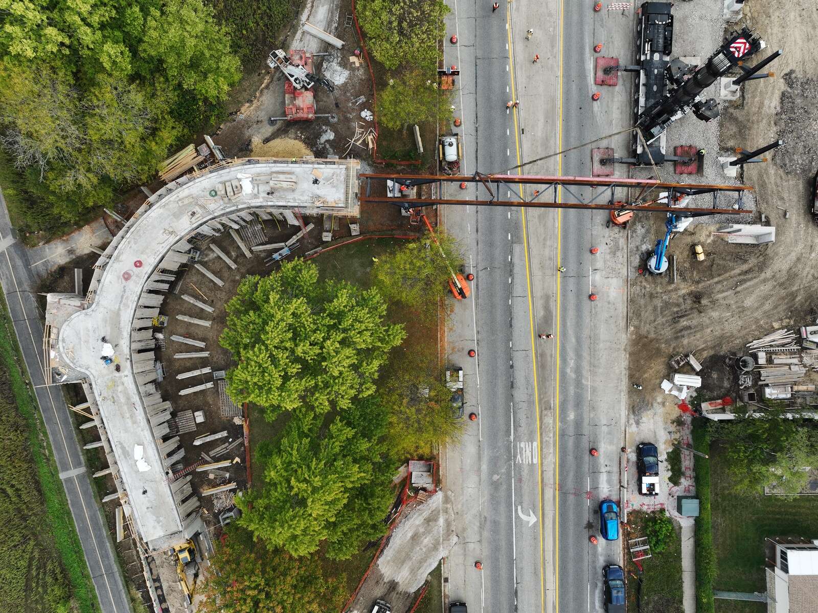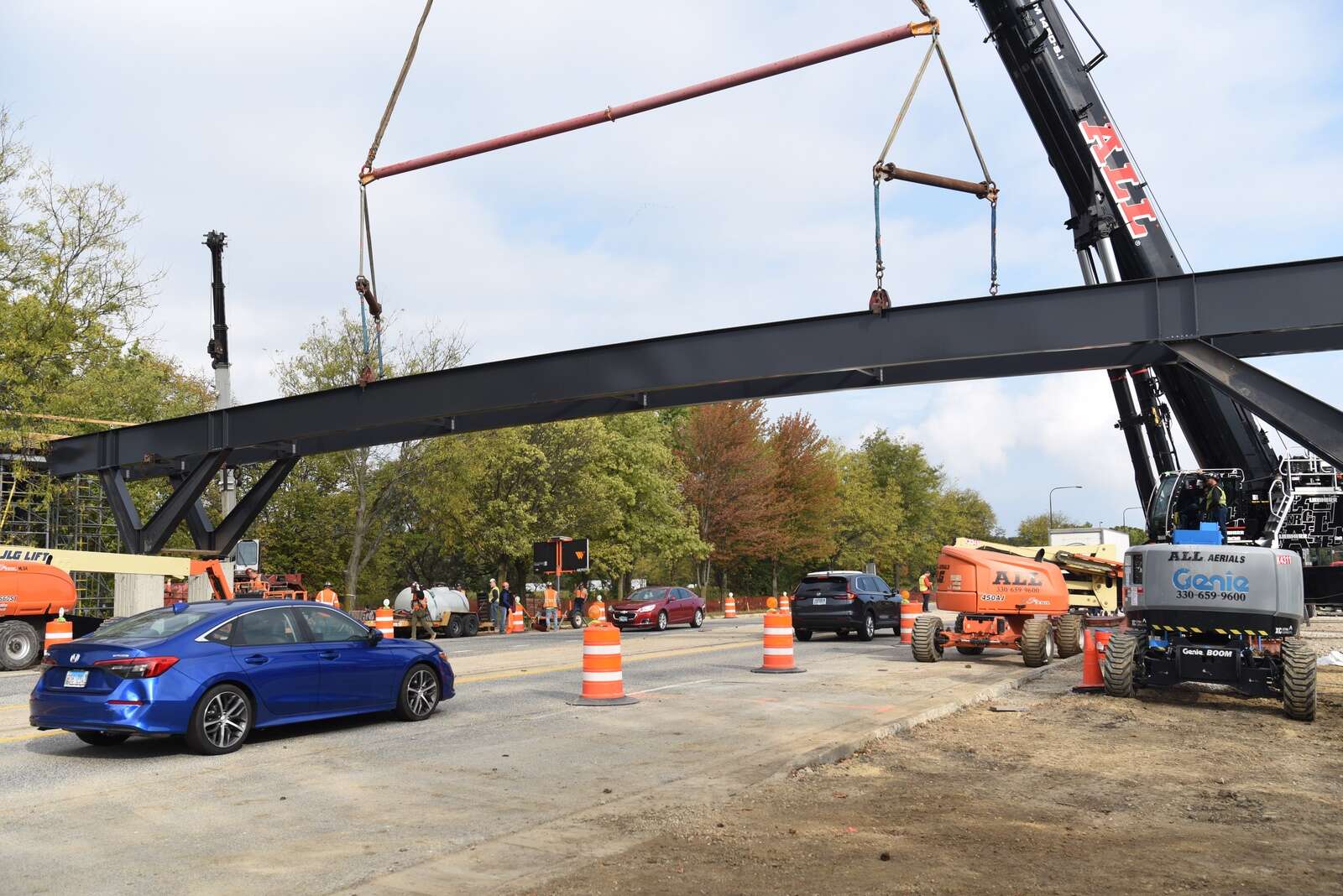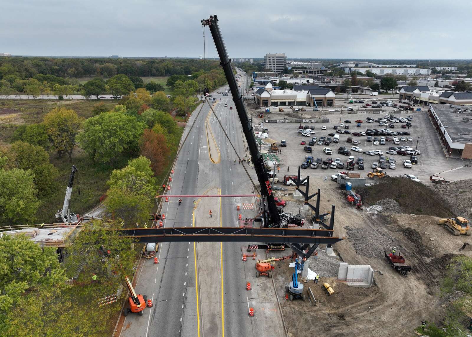 In just six minutes, the framework across the roadway was lifted into place, where construction workers installed bolts to secure it. With much of the vertical concrete and steel supports already installed, the process of placing the horizontal steel span kept Arlington Heights Road closed for less than half an hour.