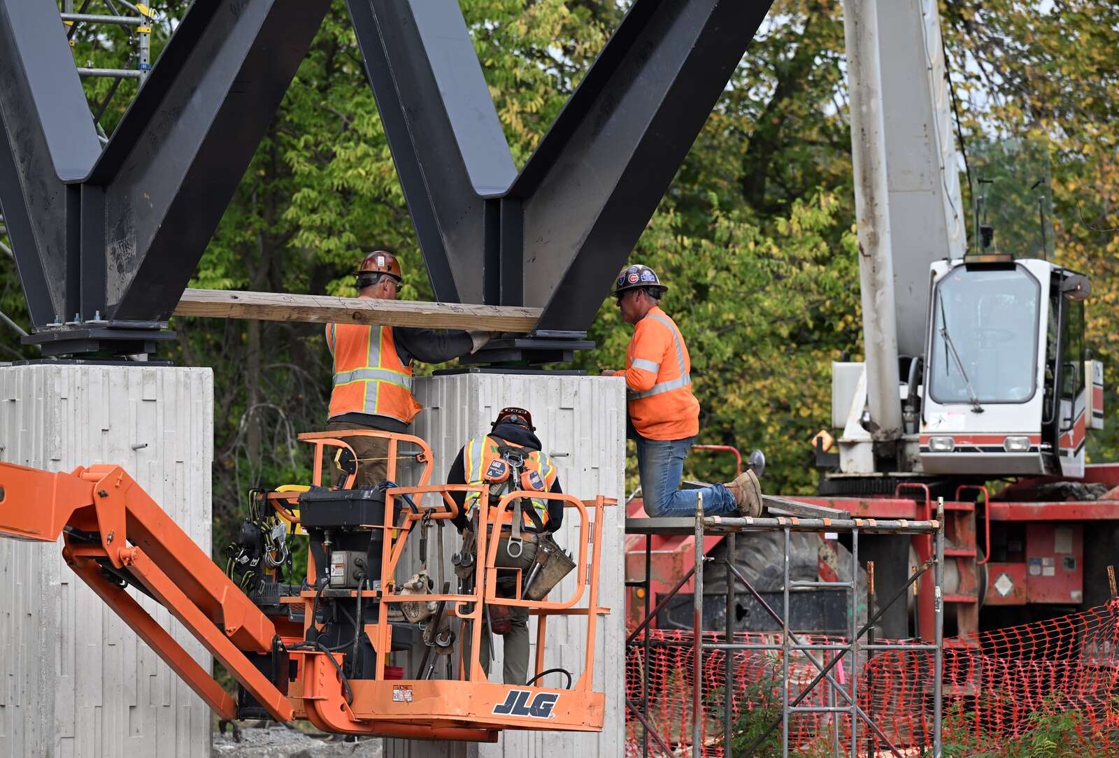 Construction crews work Tuesday to install the steel framework of a new pedestrian bridge across Arlington Heights Road in Elk Grove Village.