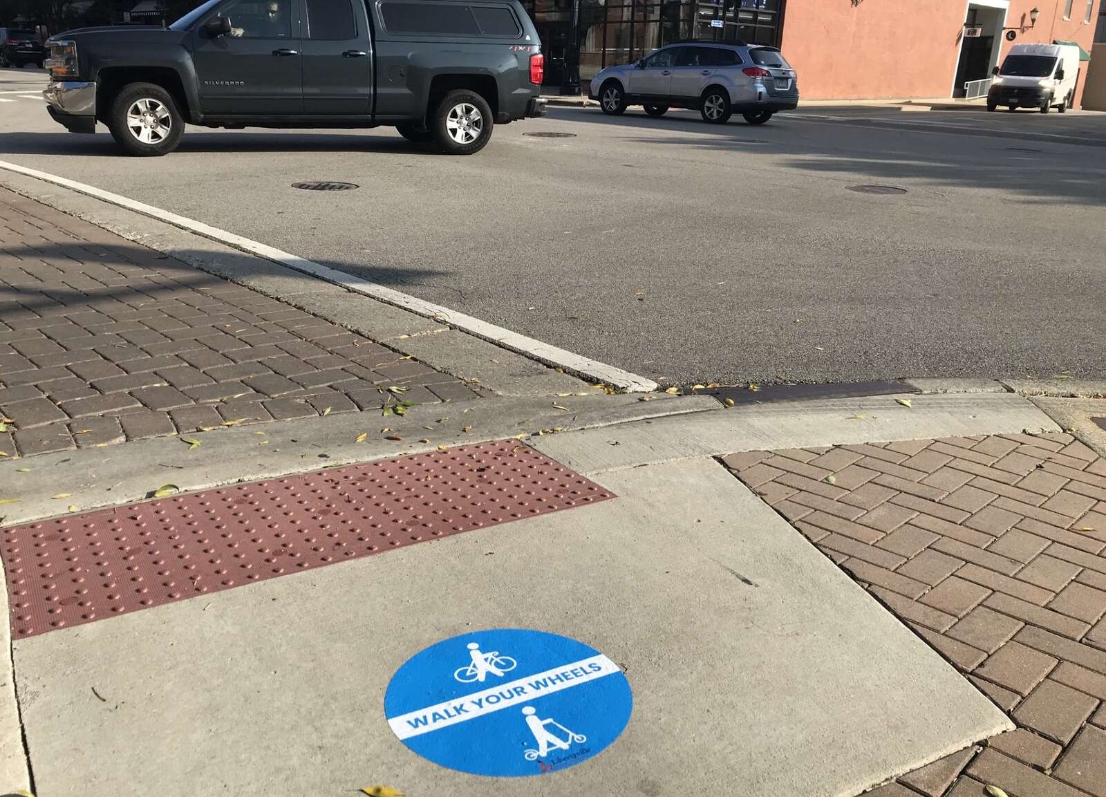 Libertyville officials went as far as to apply large, blue-and-white decals reading “Walk Your Wheels” on sidewalk corners along a stretch of Milwaukee Avenue and in Cook Park.
