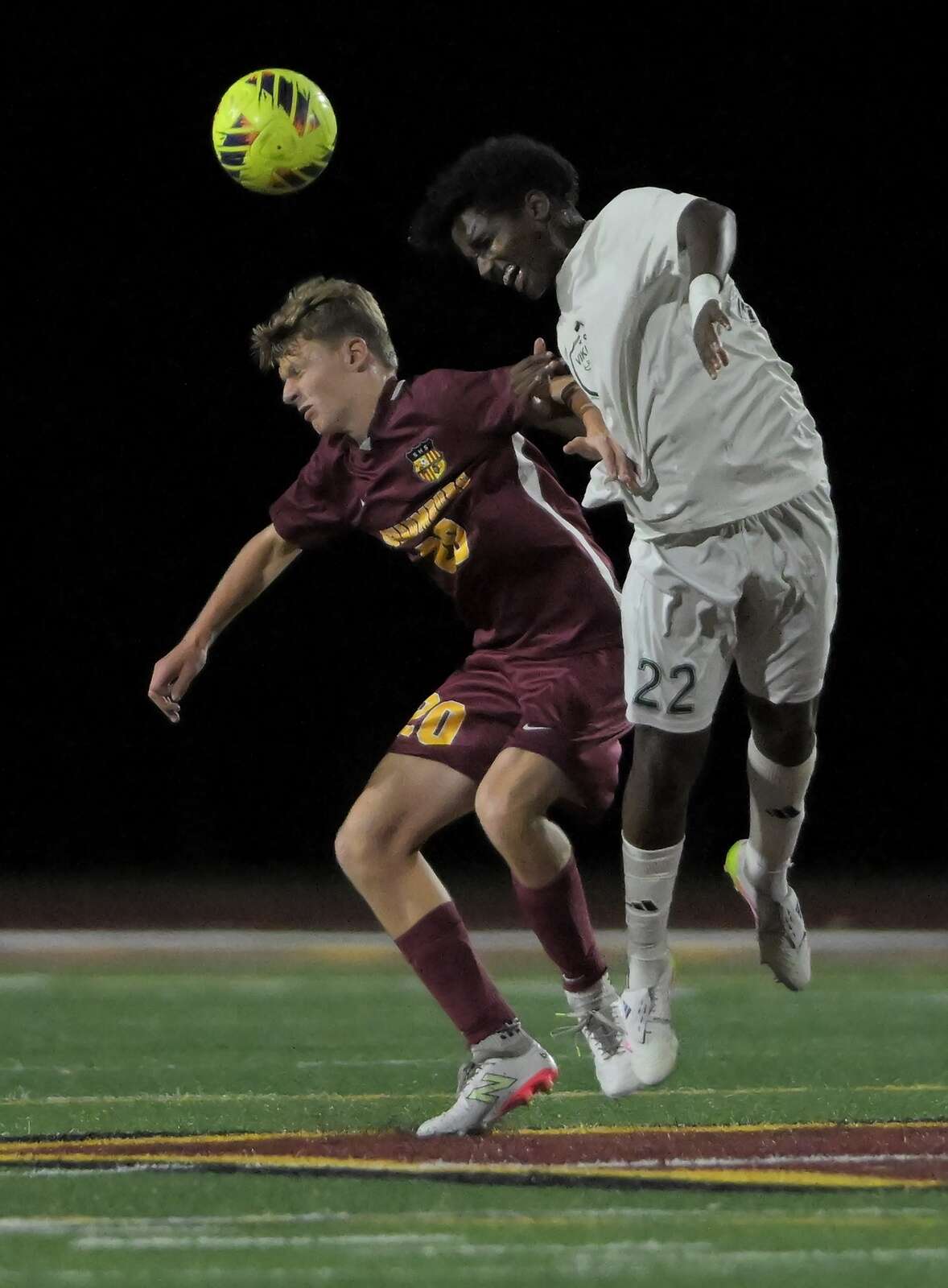 Fremd’s Adam Kowalski and Schaumburg’s Juan Carlos, right, compete for a header at the MLS Soccer Cup championship in Schaumburg on Thursday, Oct. 16, 2025. John Starks/jstarks@dailyherald.com