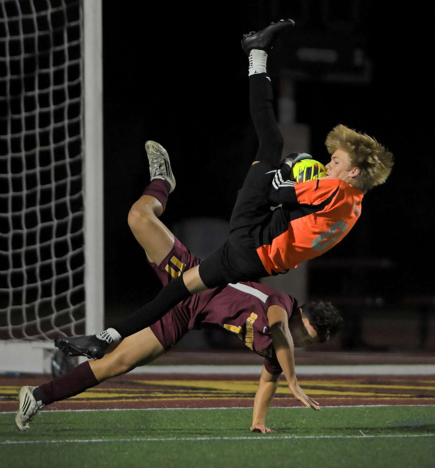 Fremd goalkeeper Logan Rolloff falls on his back after colliding with Schaumburg’s Ronaldo Loiaza-Veliz at the MLS Soccer Cup championship in Schaumburg on Thursday, Oct. 16, 2025. Rolloff left the game but returned a short time later. John Starks/jstarks@dailyherald.com