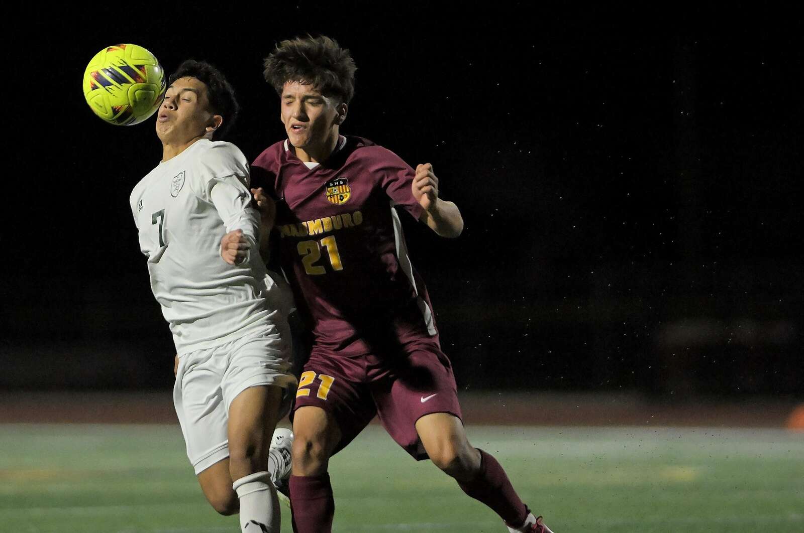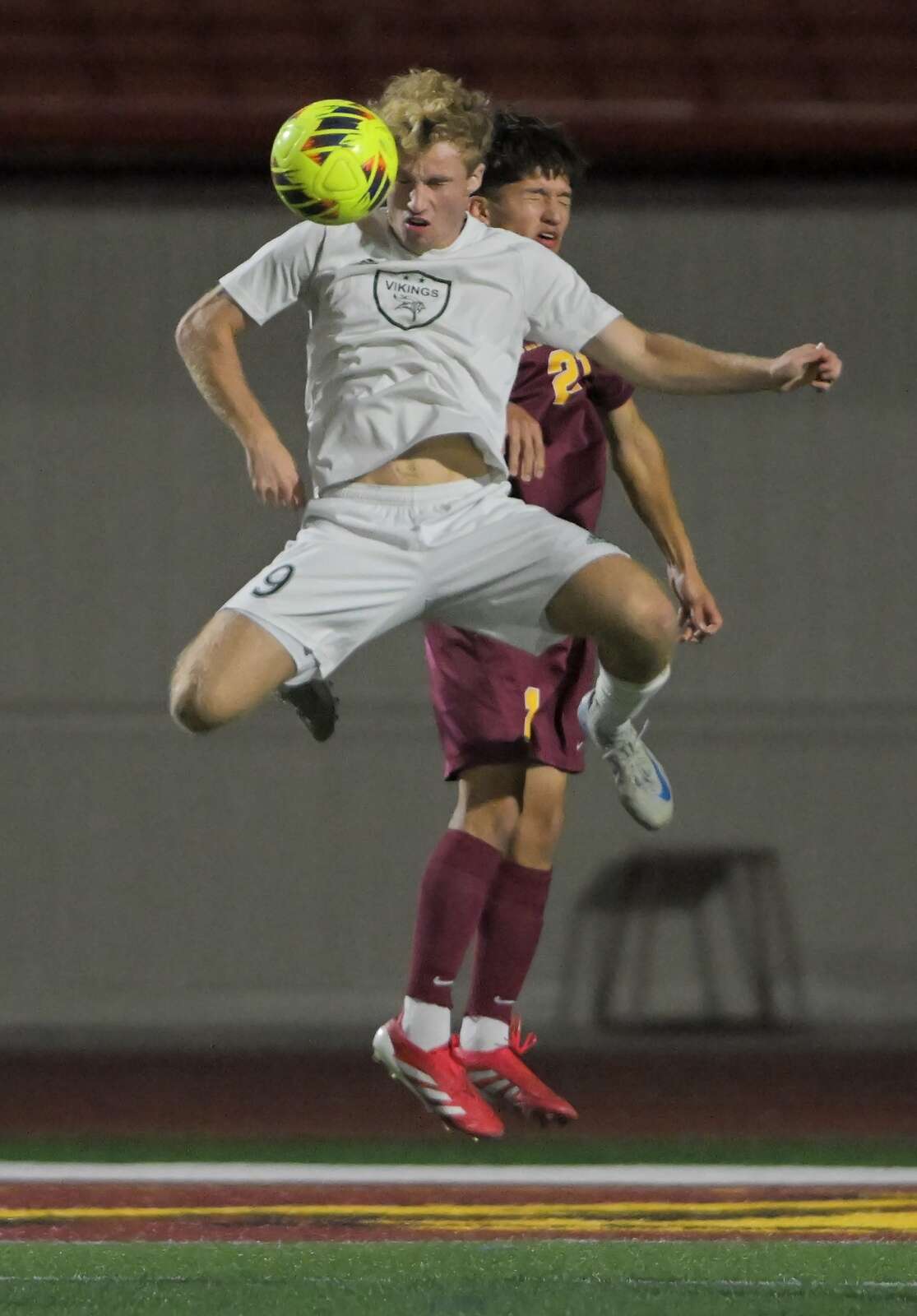Fremd’s Adam Kowalski heads the ball in front of Schaumburg’s Jesus Rosales at the MLS Soccer Cup championship in Schaumburg on Thursday, Oct. 16, 2025. John Starks/jstarks@dailyherald.com