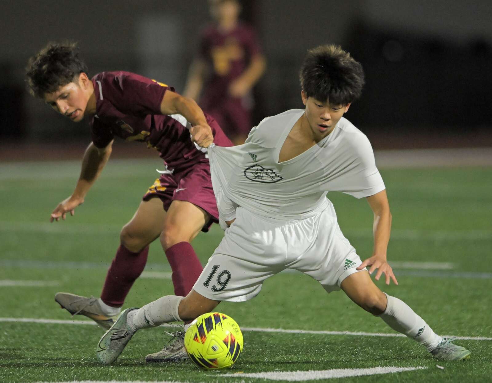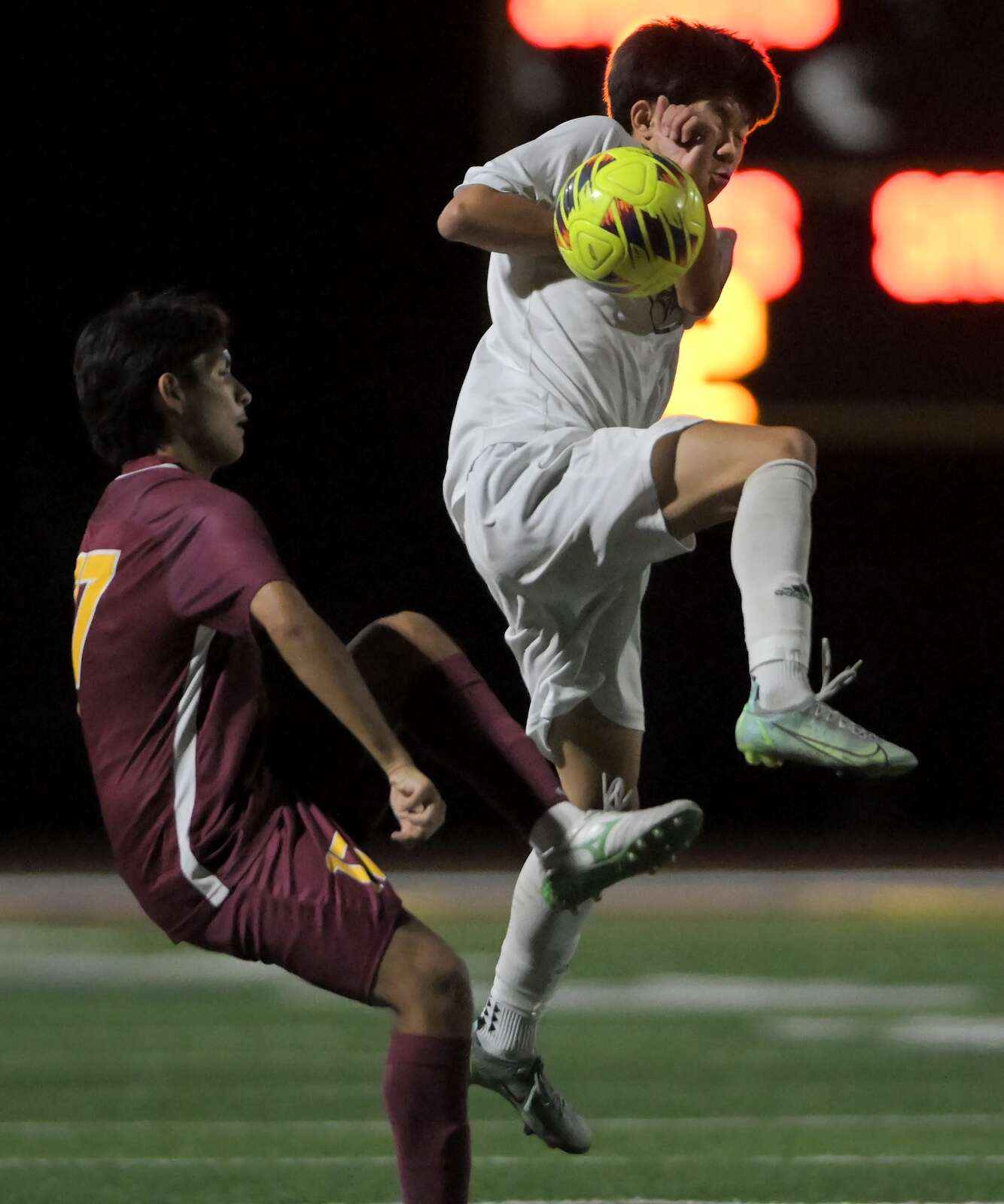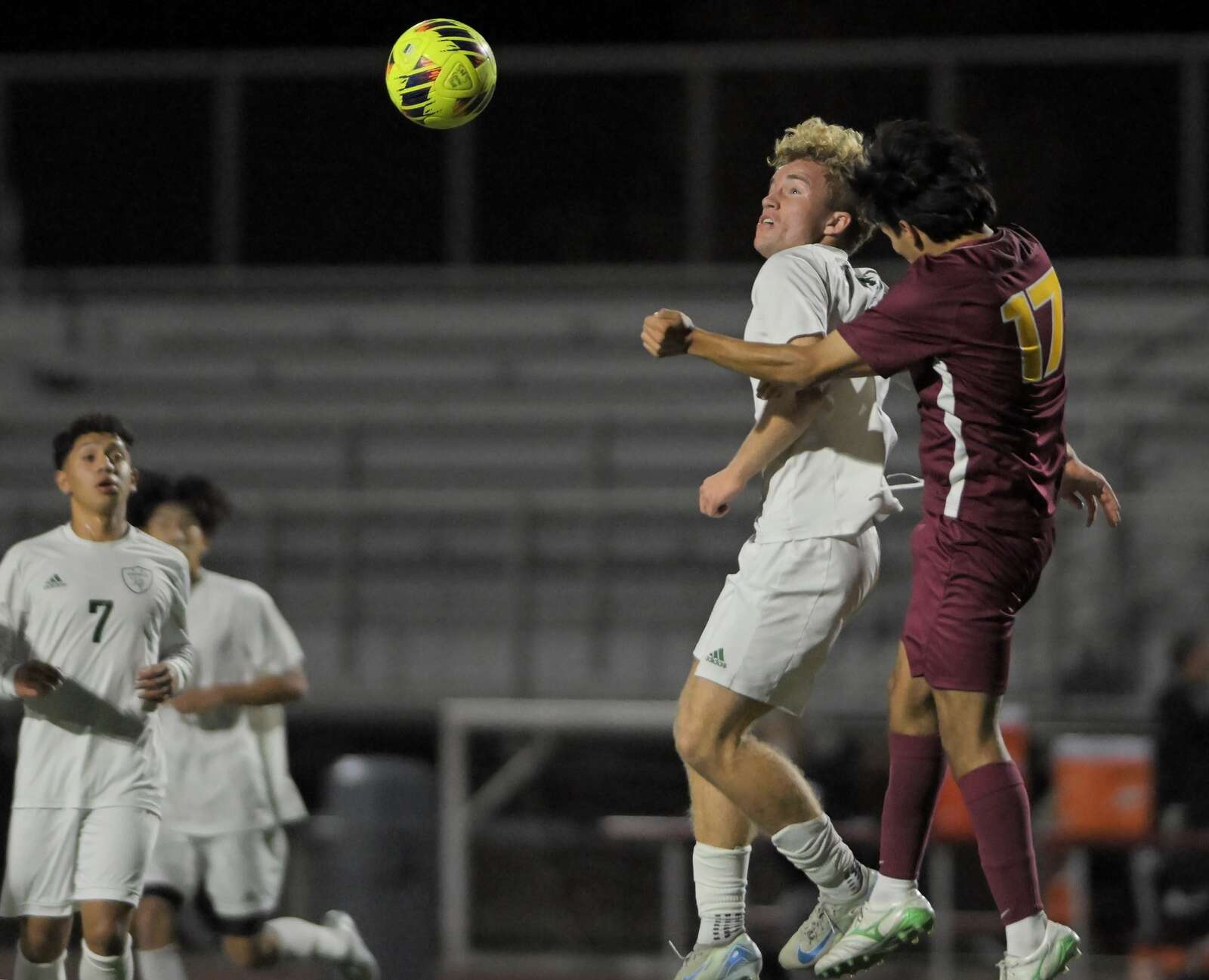 Fremd’s Hayden Santiago protects his head as he jumps to defend a kick by Schaumburg’s Juan Carlos at the MLS Soccer Cup championship in Schaumburg on Thursday, Oct. 16, 2025. John Starks/jstarks@dailyherald.com