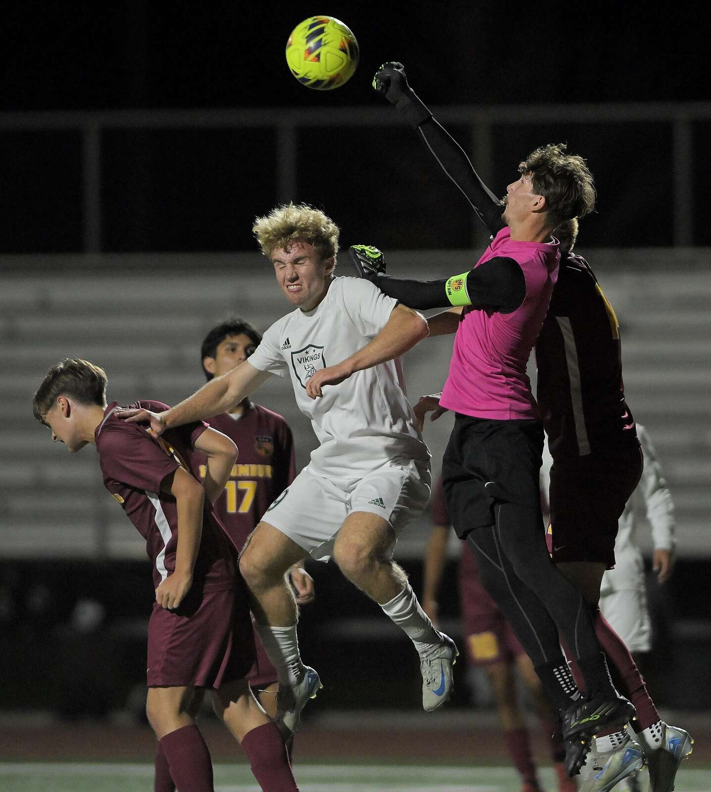 Schaumburg goalkeeper Anthony Say punches the ball away as Fremd’s Adam Kowalski battles for position at the MLS Soccer Cup championship in Schaumburg on Thursday, Oct. 16, 2025. John Starks/jstarks@dailyherald.com