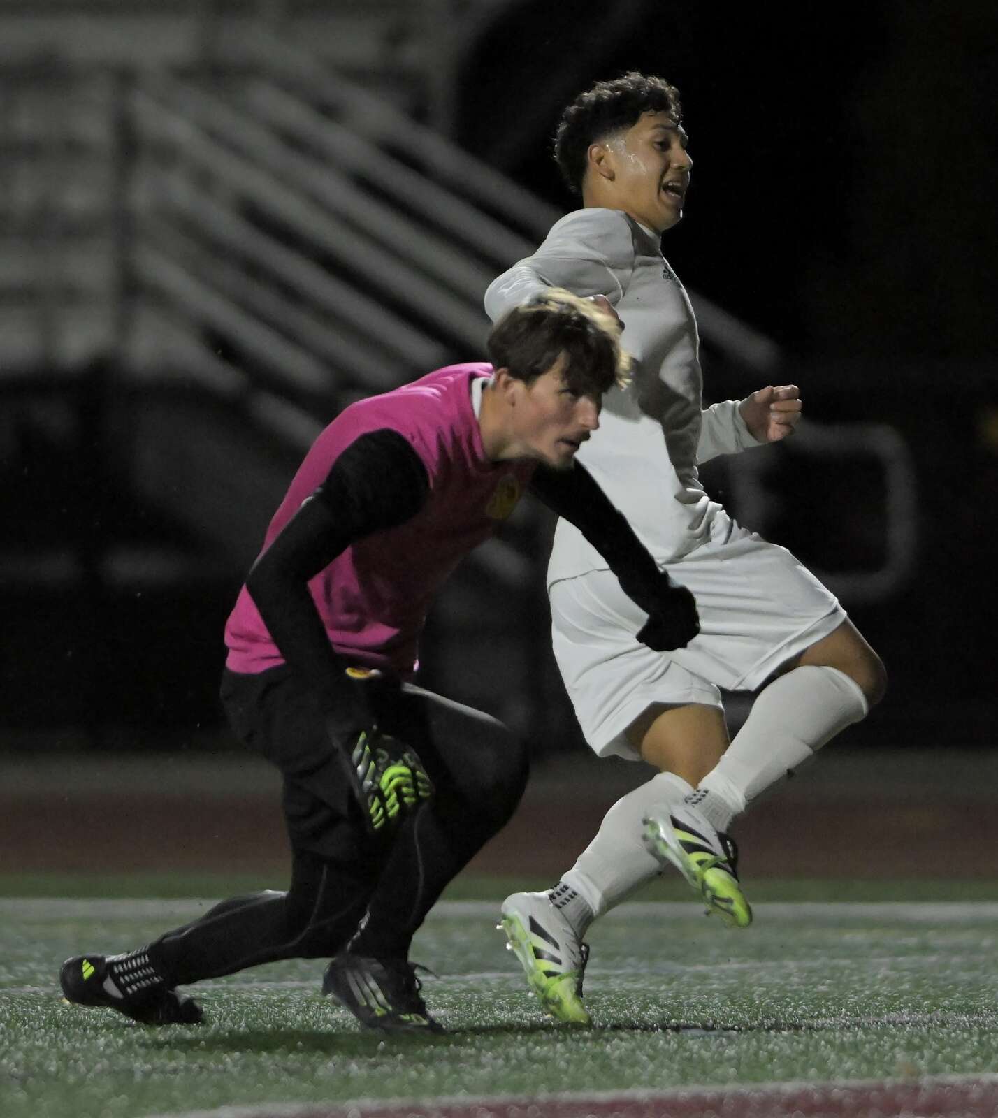 Fremd’s Jose Hernandez smiles as he sees his shot go in the net while Schaumburg goalkeeper Anthony Say watches also at the MLS Soccer Cup championship in Schaumburg on Thursday, Oct. 16, 2025. John Starks/jstarks@dailyherald.com