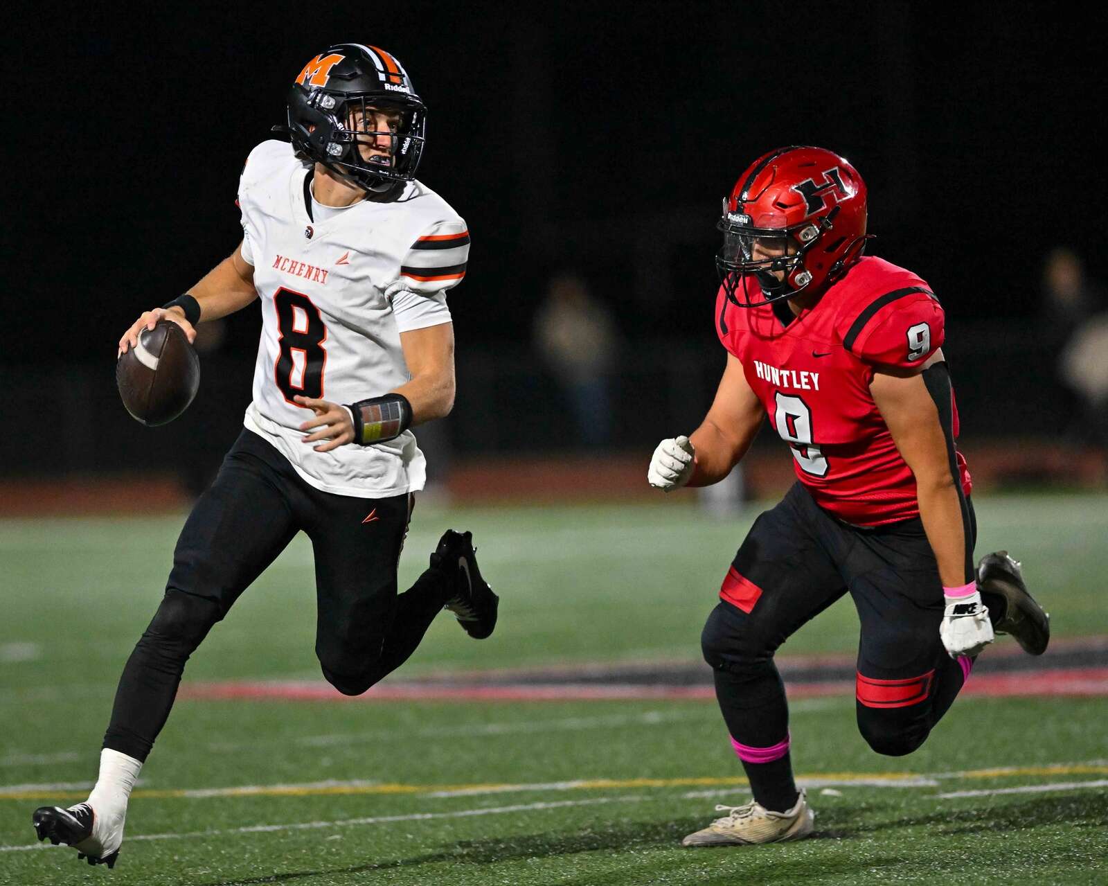 Huntley never trailed Friday, with Carter finding wide receiver Jacob Marx (seven catches, 99 yards) for a 36-yard TD pass to the end zone in the game’s opening five minutes. McHenry (2-6, 2-6) answered when QB Jeffry Schwab (18 carries, 183 yards) slipped away from a potential sack by Ethan Albertson for a 51-yard run to even the score with 6:40 left in the first.