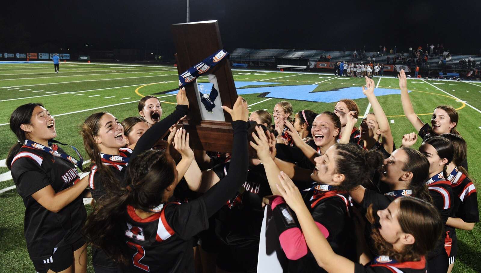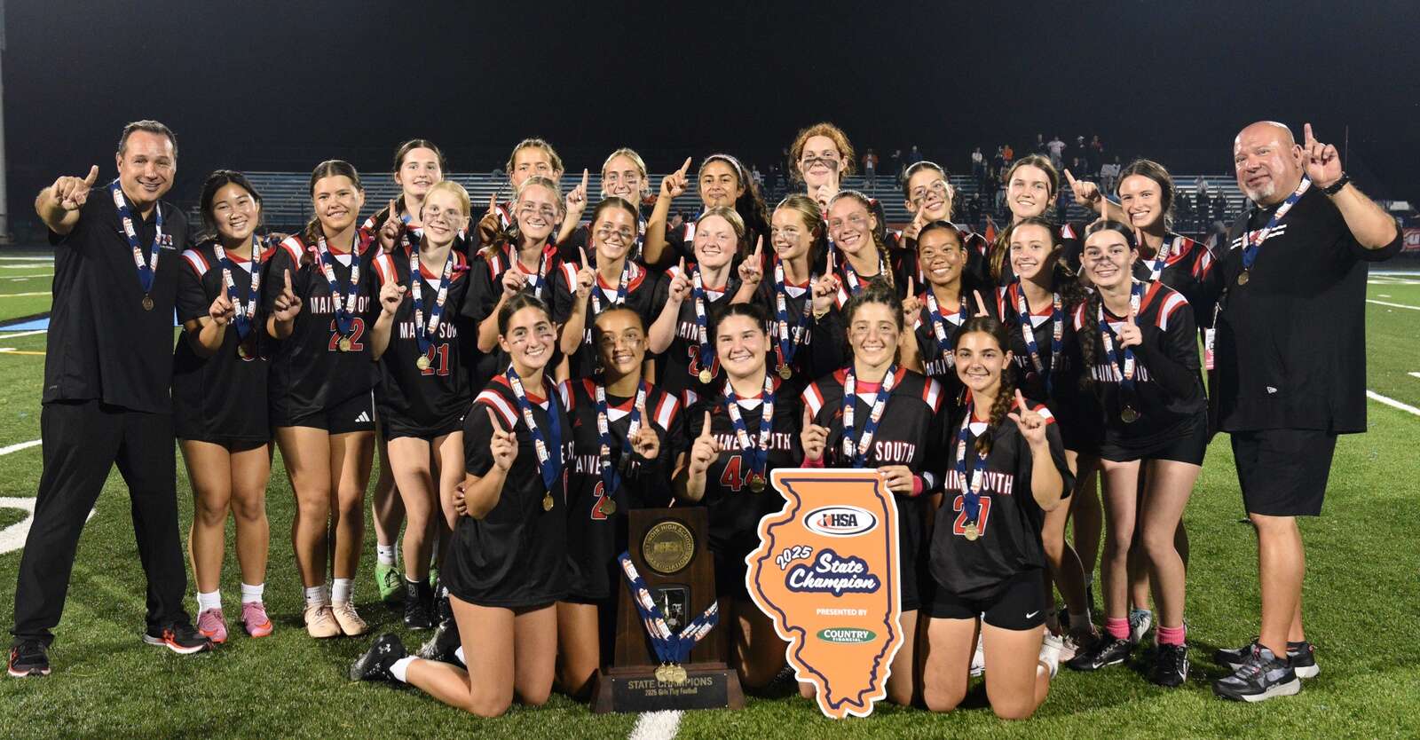 Maine South players and coaches pose with their trophy after defeating Whitney Young 26-6 during the championship game of the girls flag football state tournament at Willowbrook High School on Saturday, Oct. 18, 2025 in Villa Park.