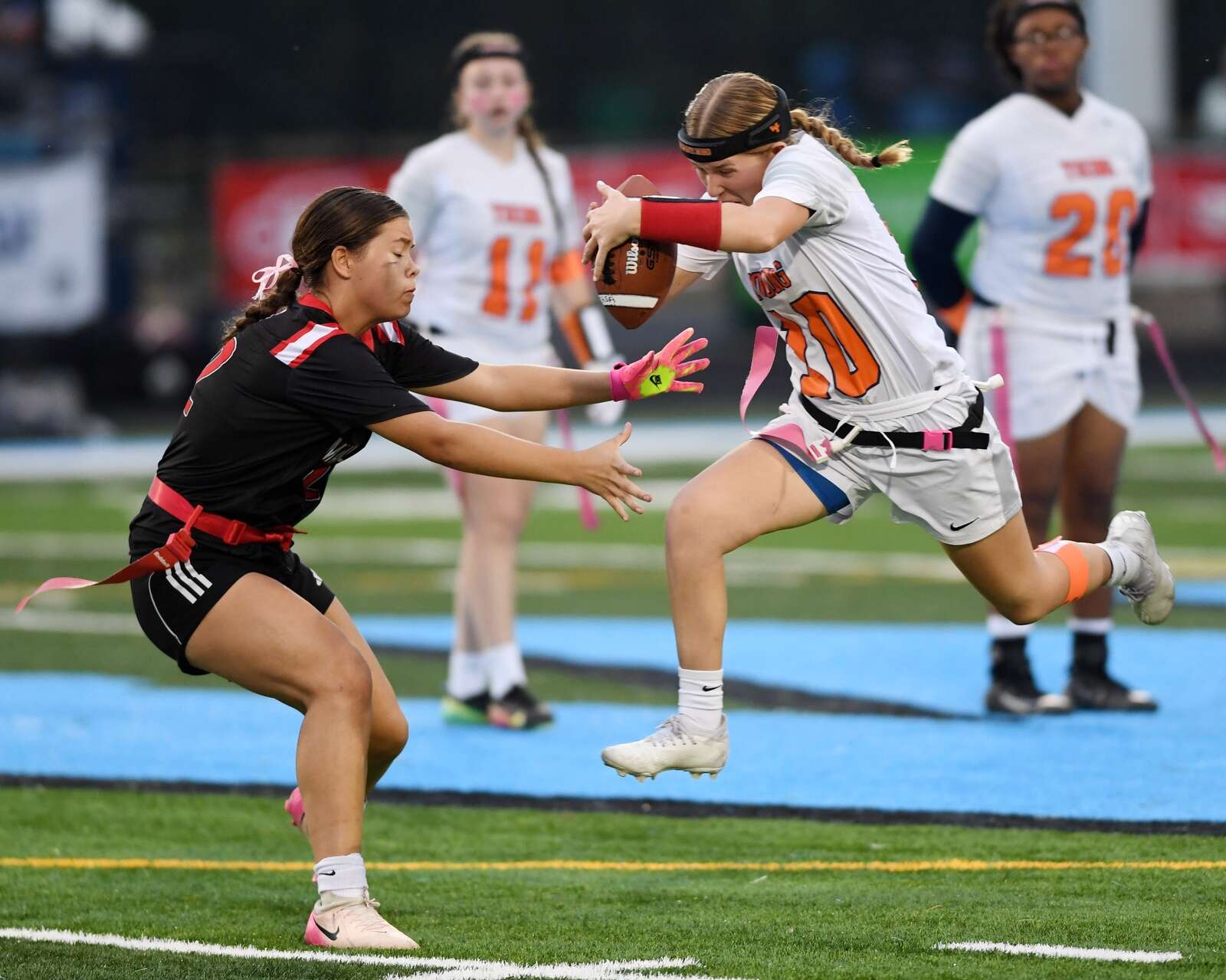 Maine South’s Emerson De La Cruz, right, tries to get past Whitney Young’s Maria Teer during the championship game of the girls flag football state tournament at Willowbrook High School on Saturday, Oct. 18, 2025 in Villa Park.