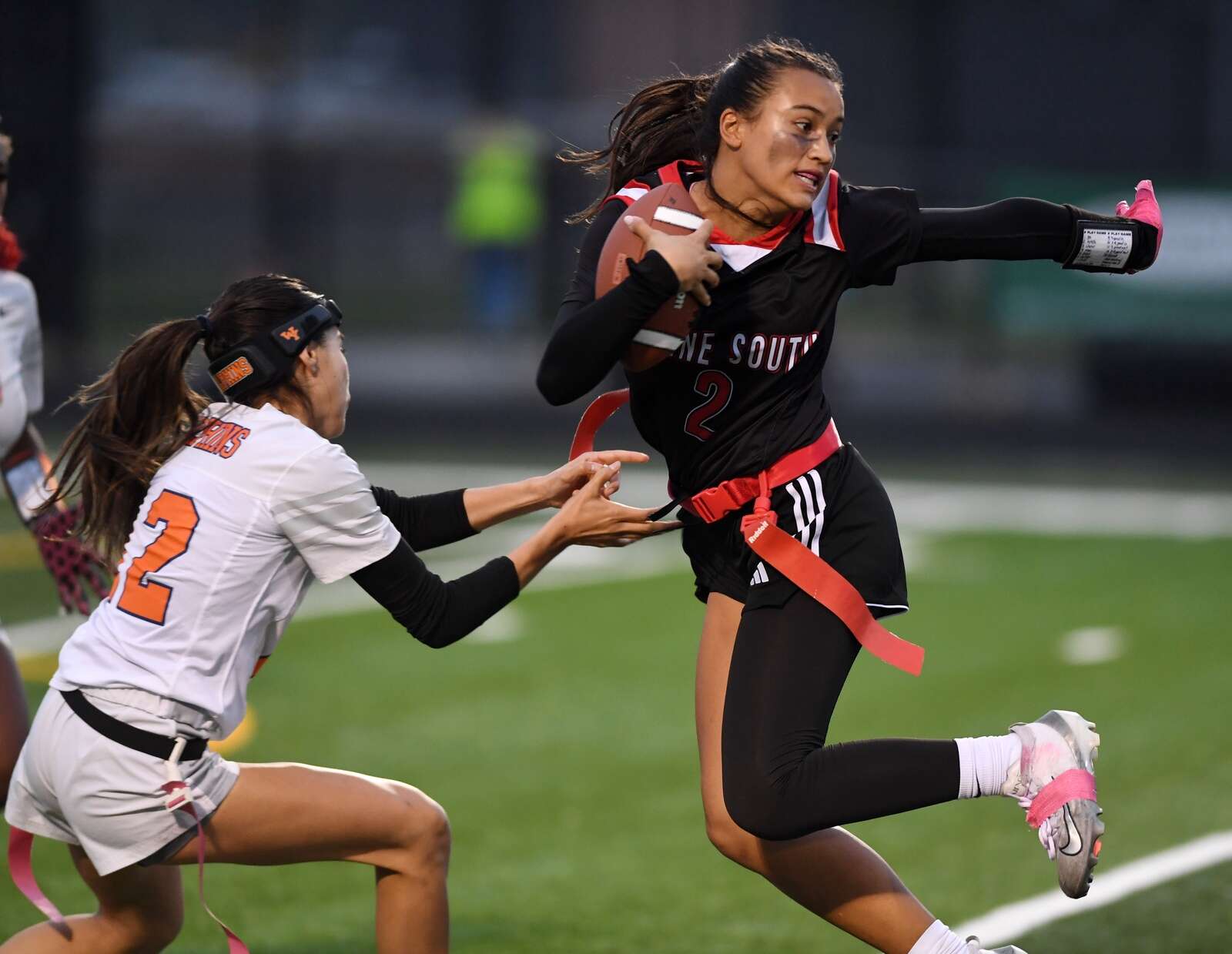 Maine South’s Emerson De La Cruz makes a move to get past Whitney Young’s Christina Pissios during the championship game of the girls flag football state tournament at Willowbrook High School on Saturday, Oct. 18, 2025 in Villa Park.