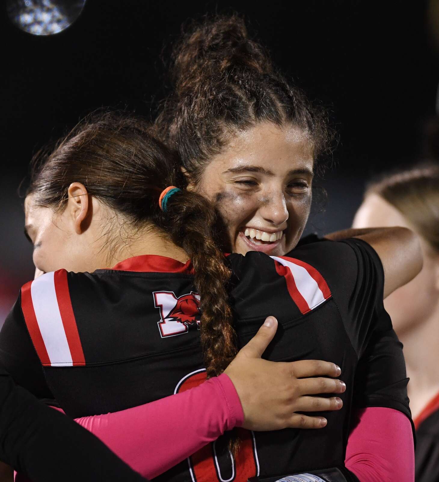 Maine South’s Aribella Spandiary, right, hugs teammate Amelia Fernandez as the Hawks close in on victory during the championship game of the girls flag football state tournament at Willowbrook High School on Saturday, Oct. 18, 2025 in Villa Park.
