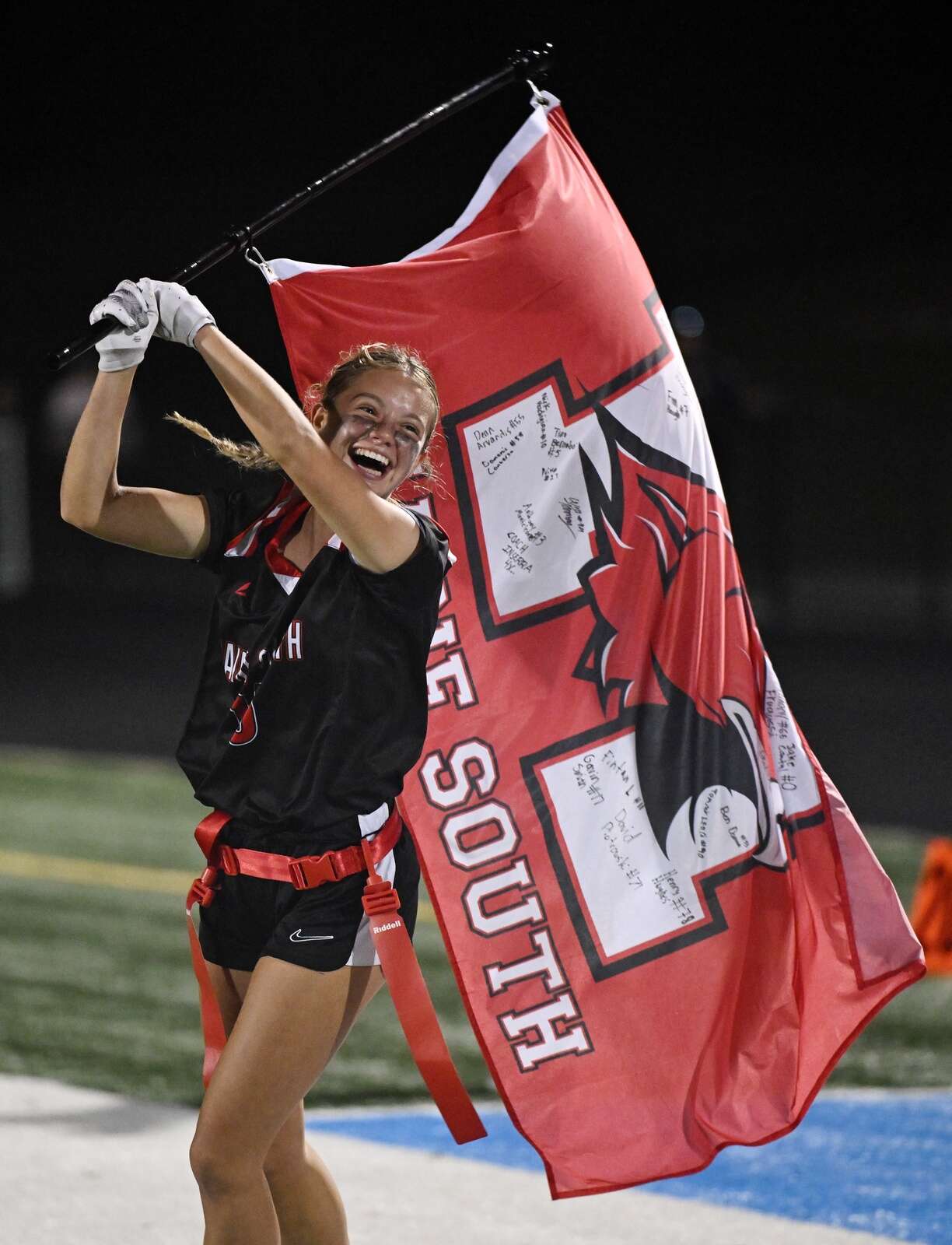 Maine South’s Reese Froeschle carries the school flag after the Hawks defeated Whitney Young 26-6 during the championship game of the girls flag football state tournament at Willowbrook High School on Saturday, Oct. 18, 2025 in Villa Park.