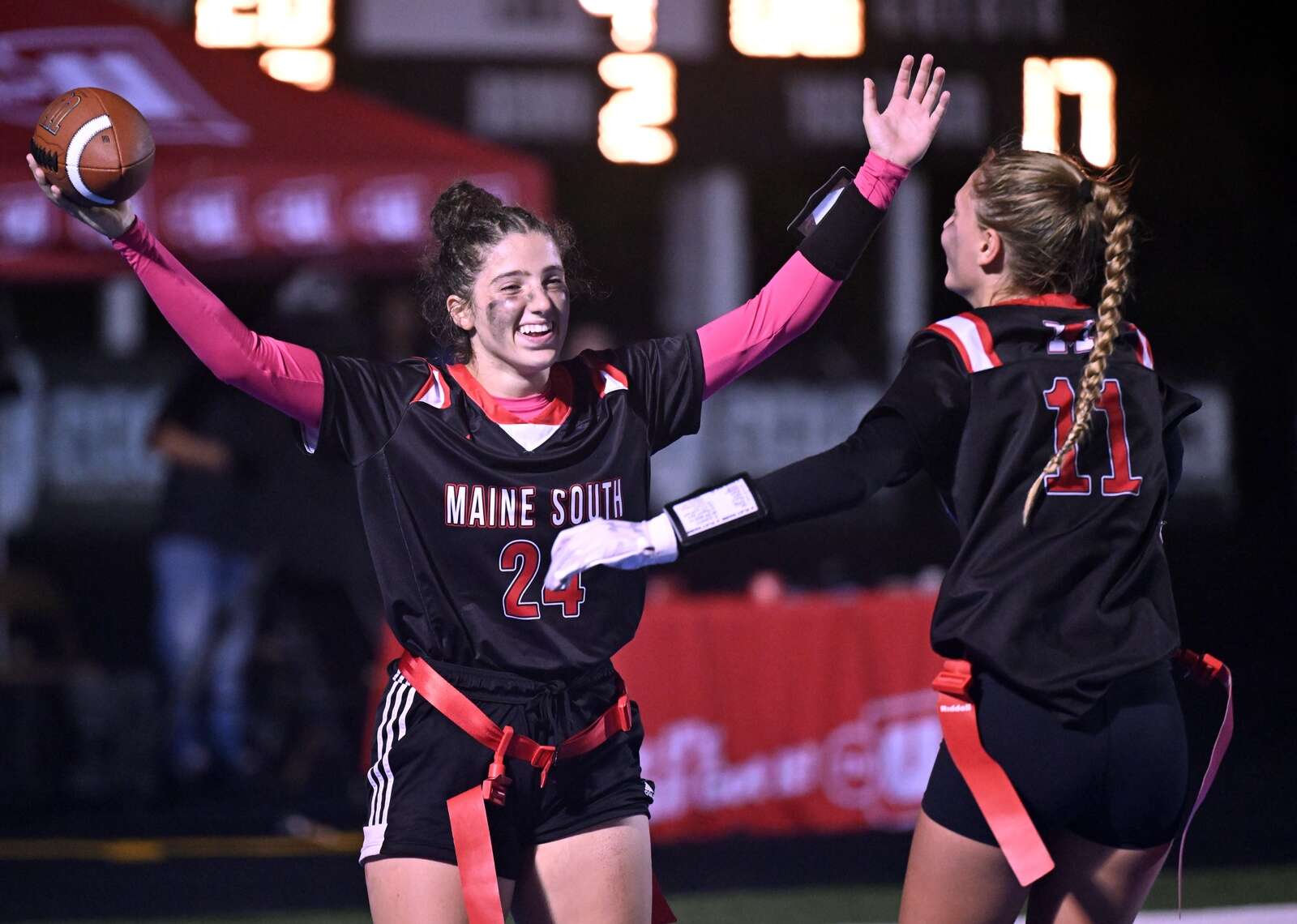 Maine South’s Aribella Spandiary, left, celebrates her fourth-quarter touchdown with Nellie Ossmo during the championship game of the girls flag football state tournament at Willowbrook High School on Saturday, Oct. 18, 2025 in Villa Park.