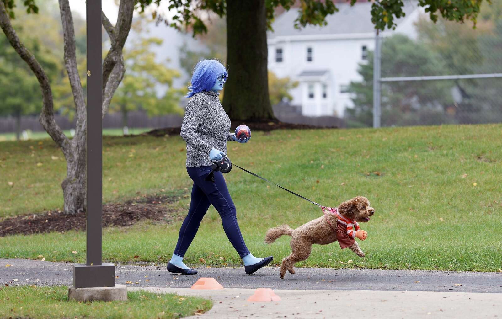 Meredith Satyawakta of Buffalo Grove walks her dog, Anxiety, a mini golden doodle before the canine costume contest and doggy egg hunt Saturday at the Dan Schimmel Pavilion in Willow Stream Park in Buffalo Grove.
