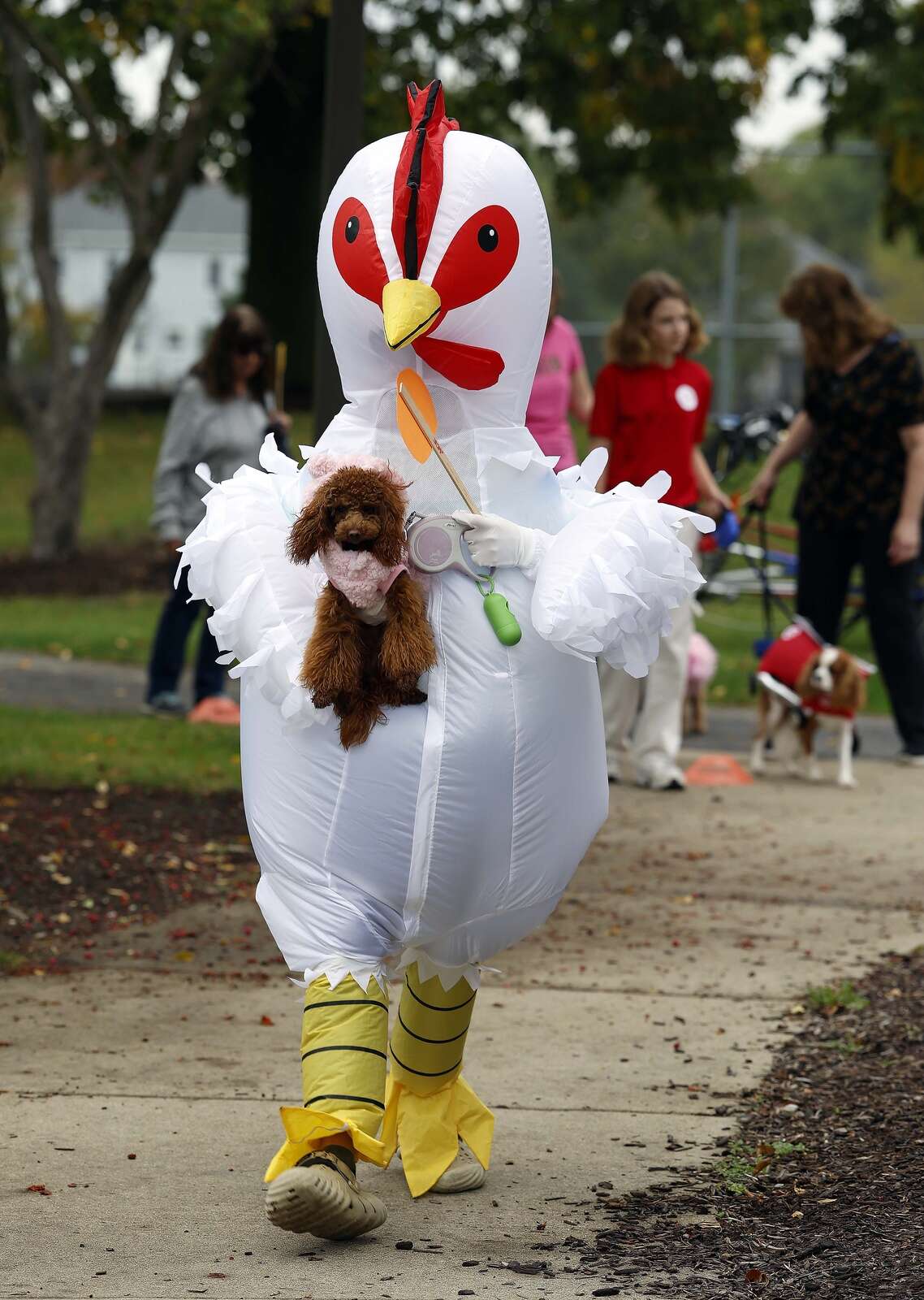 Daniel Zhuravnskiy, 12, of Arlington Heights dressed as a chicken carries his dog, Daisy, who is dressed as a pig Saturday during the canine costume contest and doggy egg hunt at the Dan Schimmel Pavilion in Willow Stream Park in Buffalo Grove.