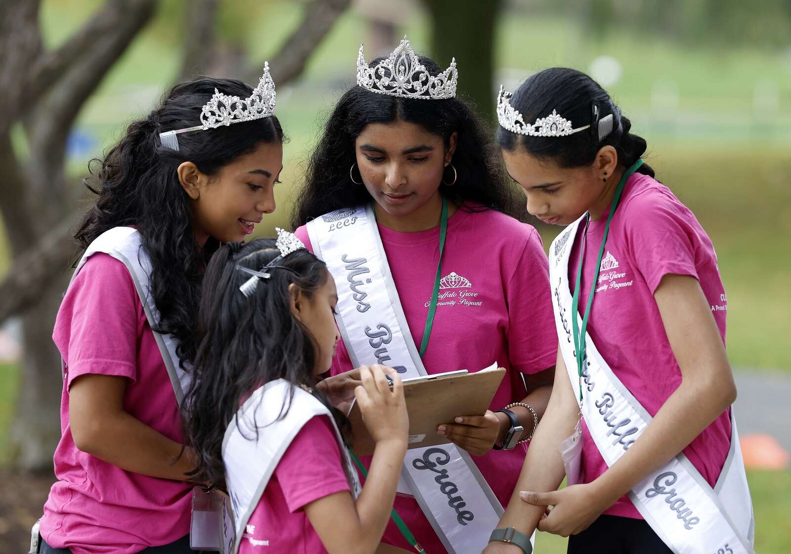 Buffalo Grove Queens Aarohi Charanpahari, 8, Gianna Hernandez, 15, Sahana Raja, 17, and Yukttha rajhamurugan, 11, act as judges during the canine costume contest and doggy egg hunt Saturday at the Dan Schimmel Pavilion in Willow Stream Park in Buffalo Grove.