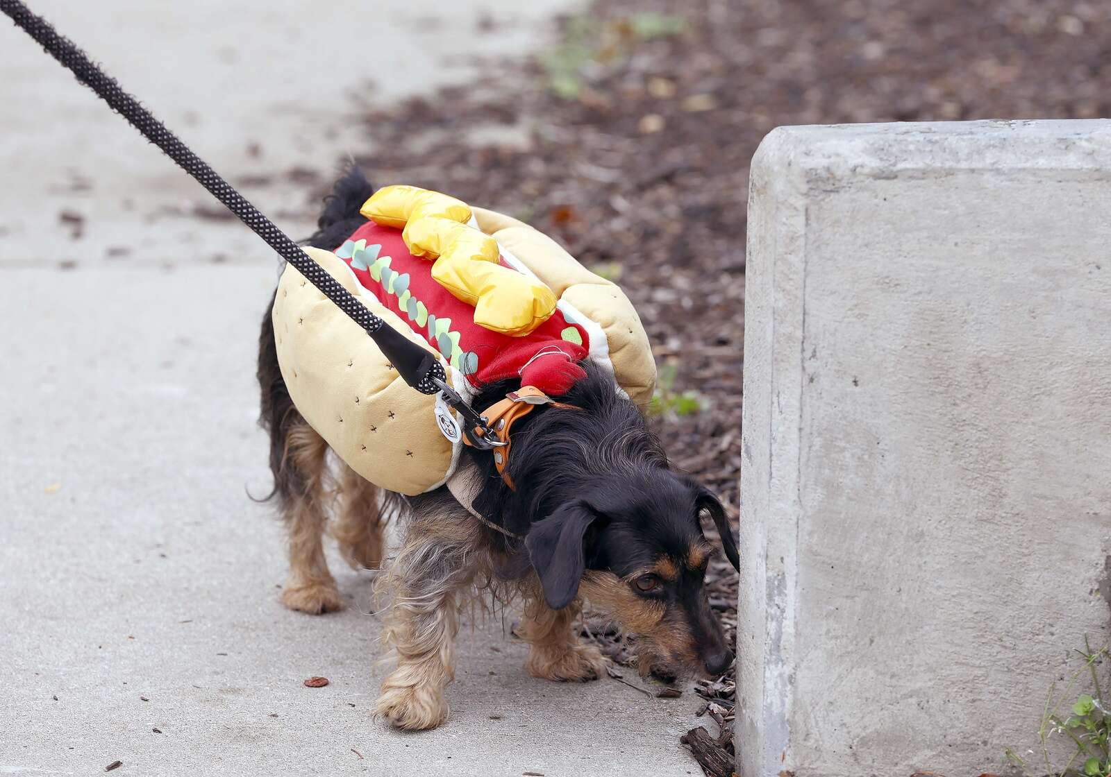 A dog dressed as a “hot dog” takes a sniff during the canine costume contest and doggy egg hunt Saturday at the Dan Schimmel Pavilion in Willow Stream Park in Buffalo Grove.