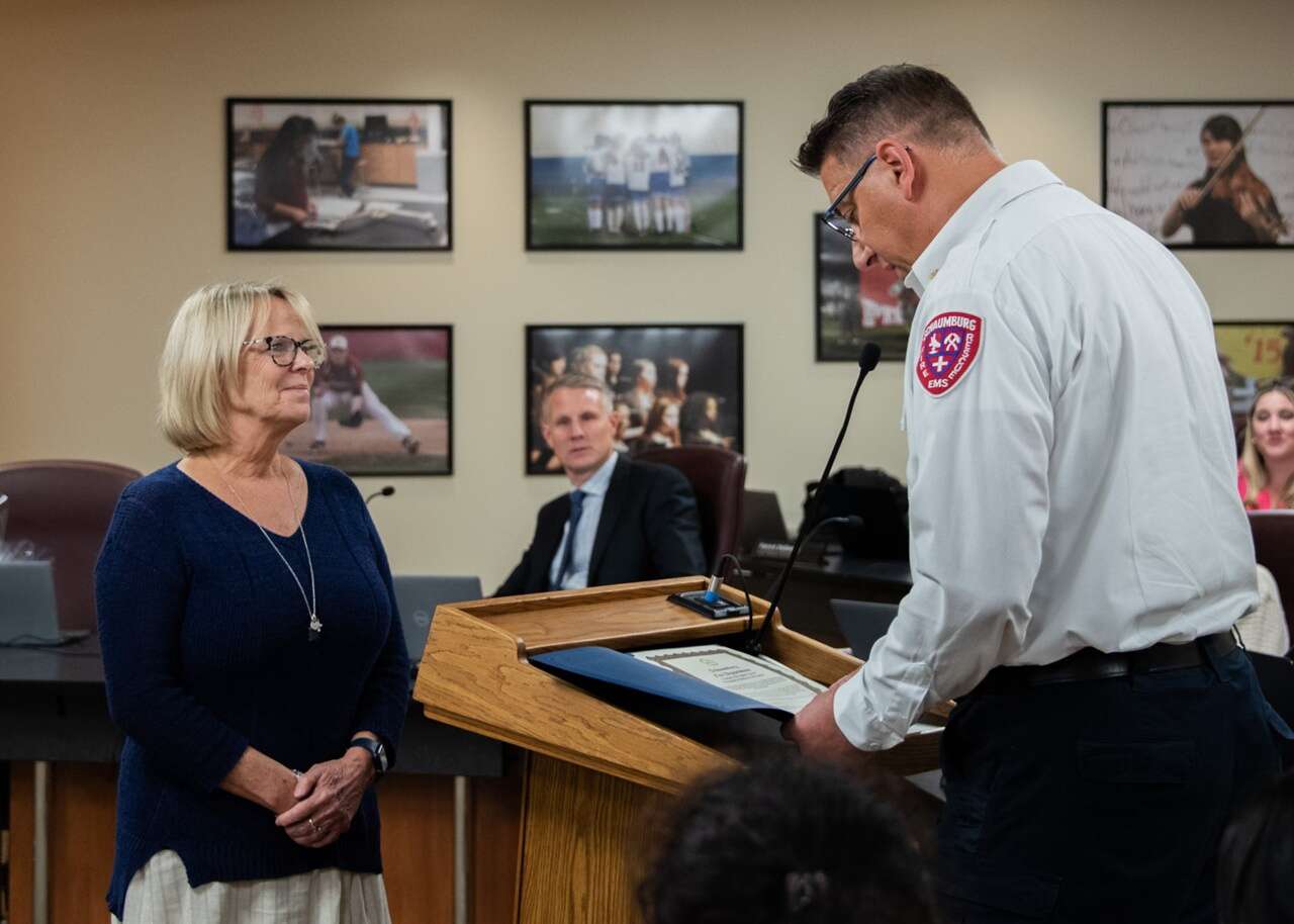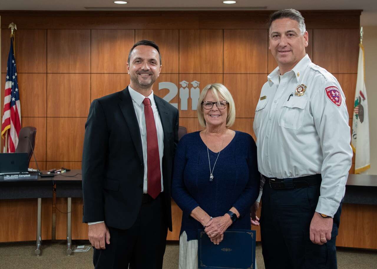 And she was honored for it by Schaumburg Fire Chief Fabio Puccini at last week’s Palatine-Schaumburg High School District 211 board meeting.