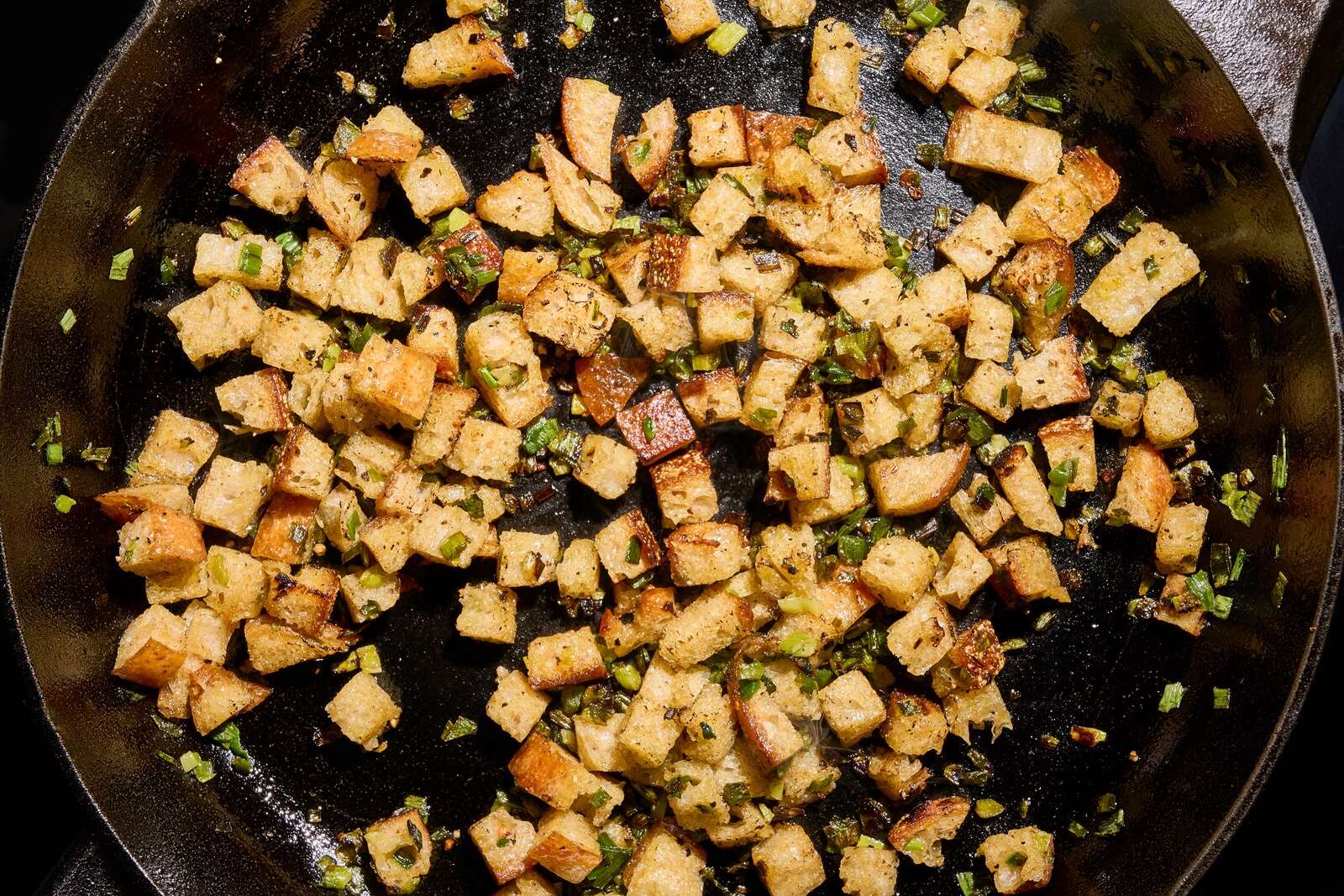 While the broth mixture cooks, in a large (12-inch) skillet over medium heat, combine the remaining 3 tablespoons of oil, the remaining 3 cups of bread and the reserved scallion greens. Sprinkle with the pepper and salt, and cook, stirring occasionally, until the croutons are browned and crisp, about 10 minutes. Remove from the heat. You should have about 2 cups, as the bread shrinks during cooking.