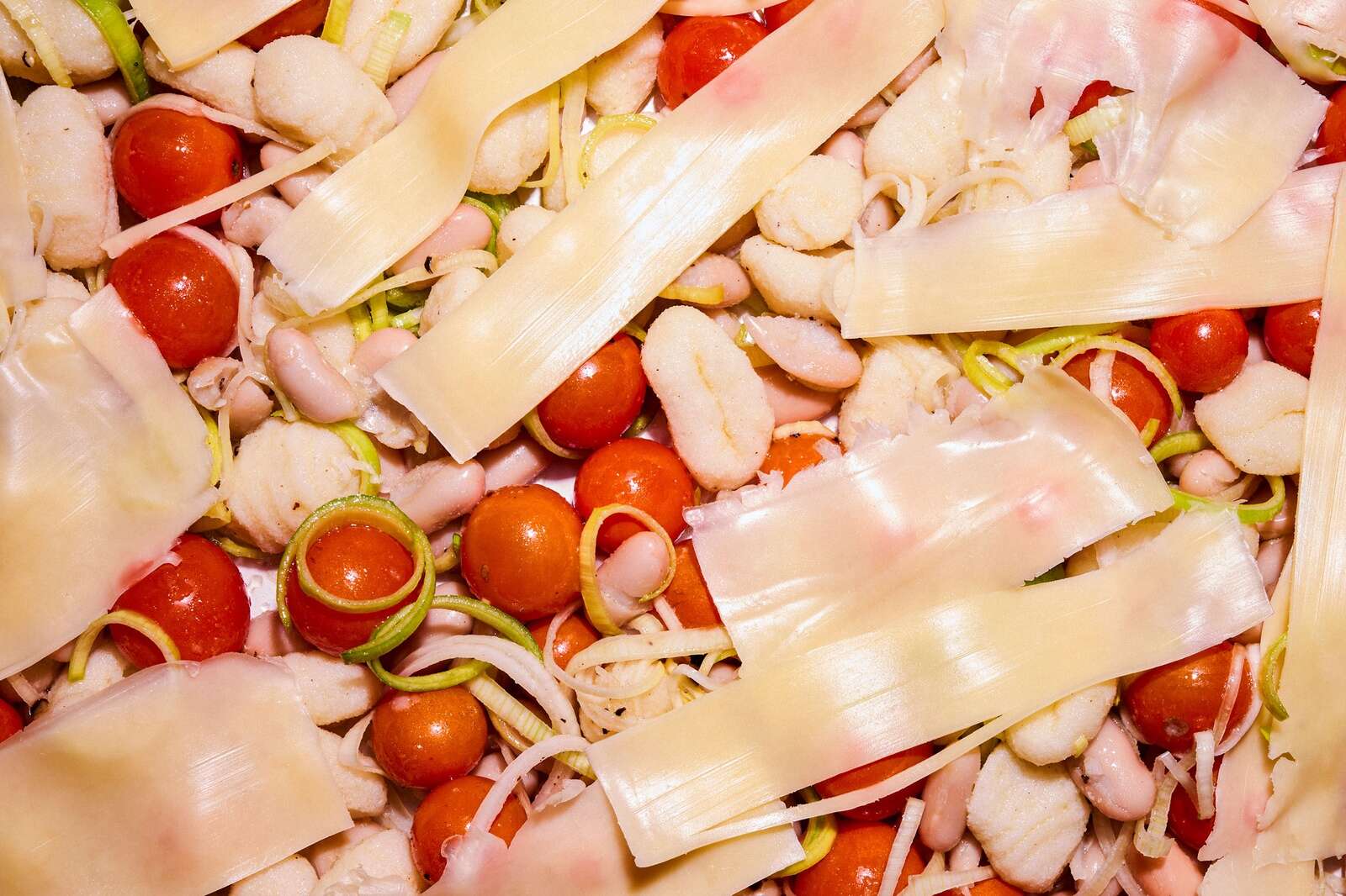 Evenly distribute the Gouda over everything and transfer to the oven. Roast for 25 to 30 minutes, or until the tomatoes are slumped and juicy, the leeks and gnocchi are browned around the edges, and the cheese melts or, ideally, turns into crisp fricos.