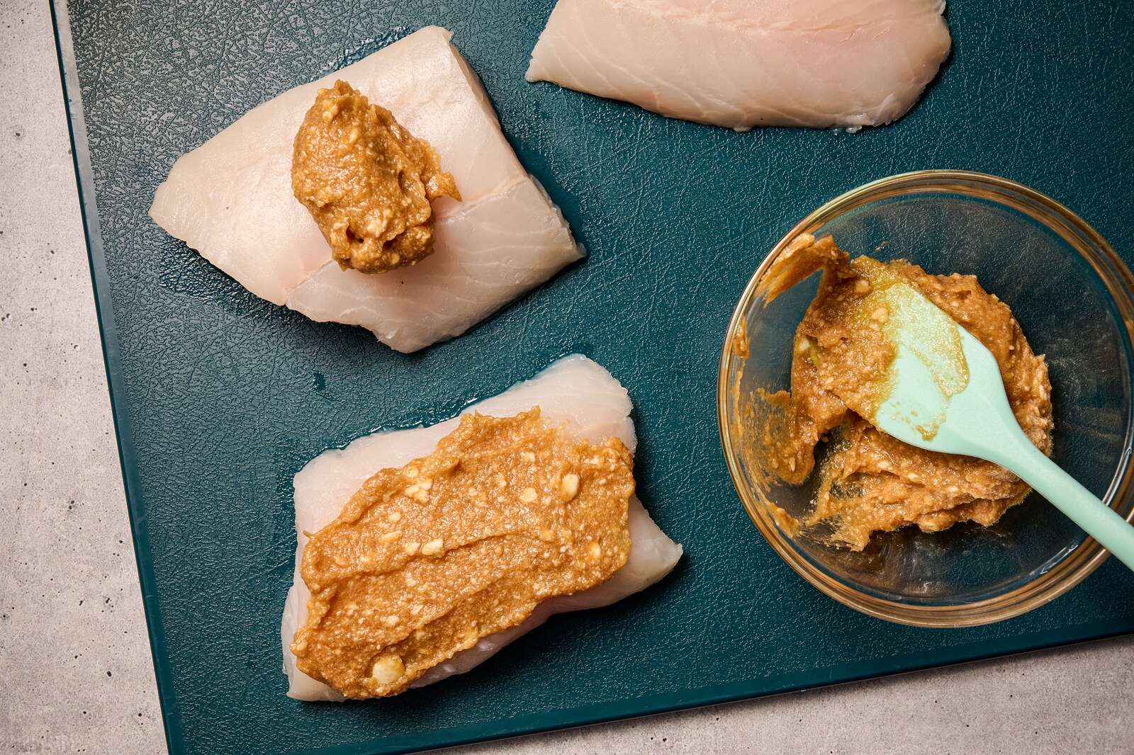 Spread a scant 1 tablespoon of the miso mixture on top of each cod fillet.