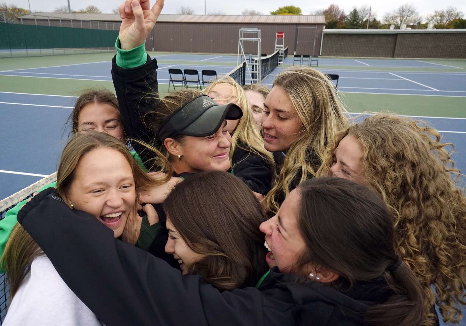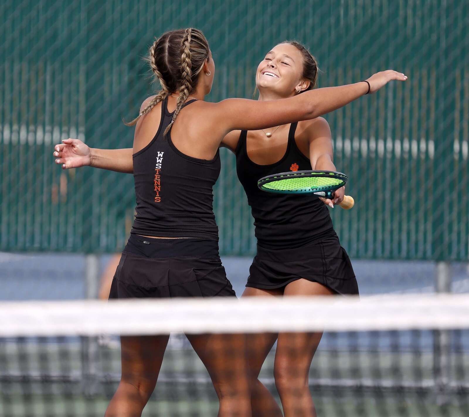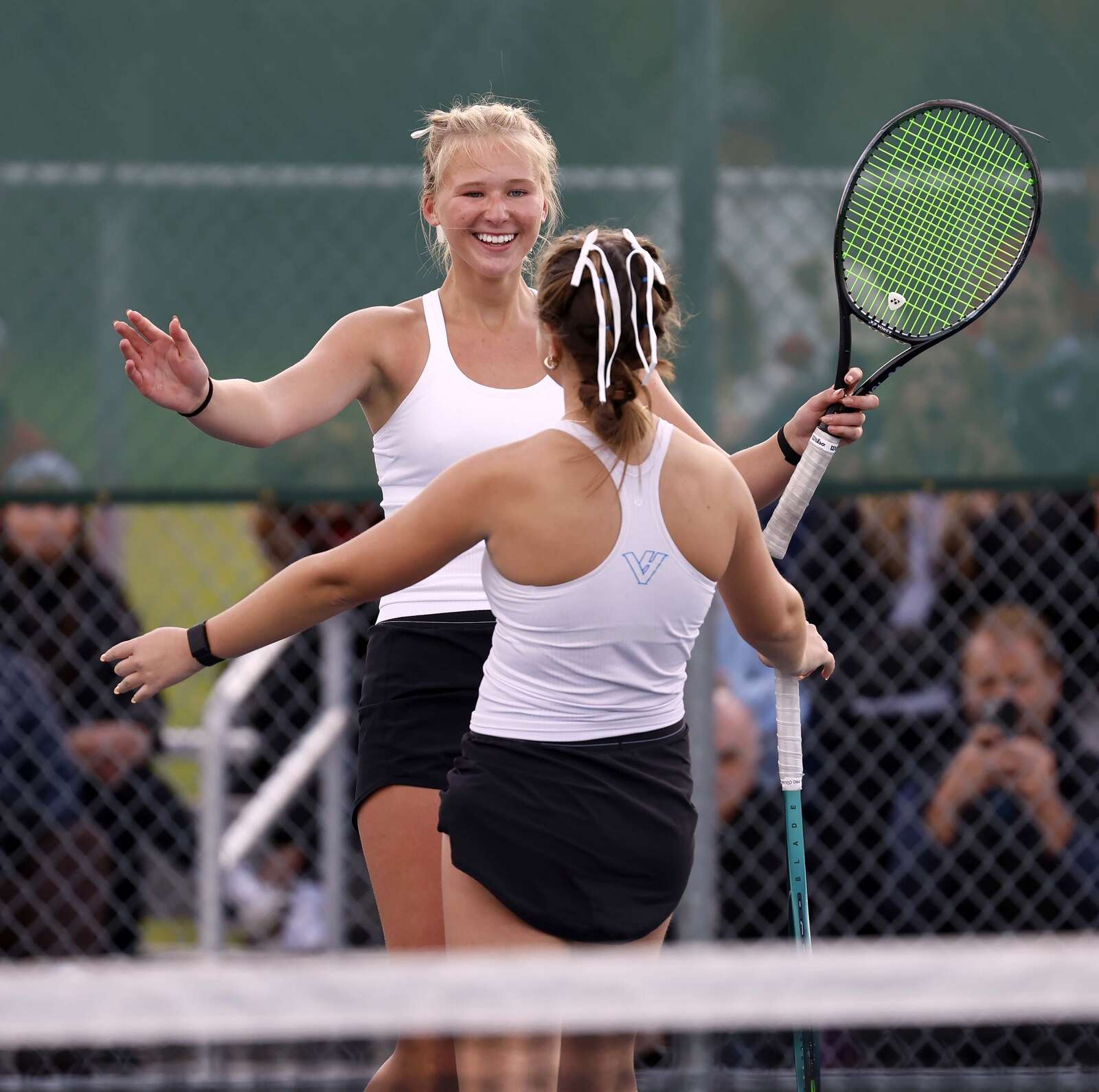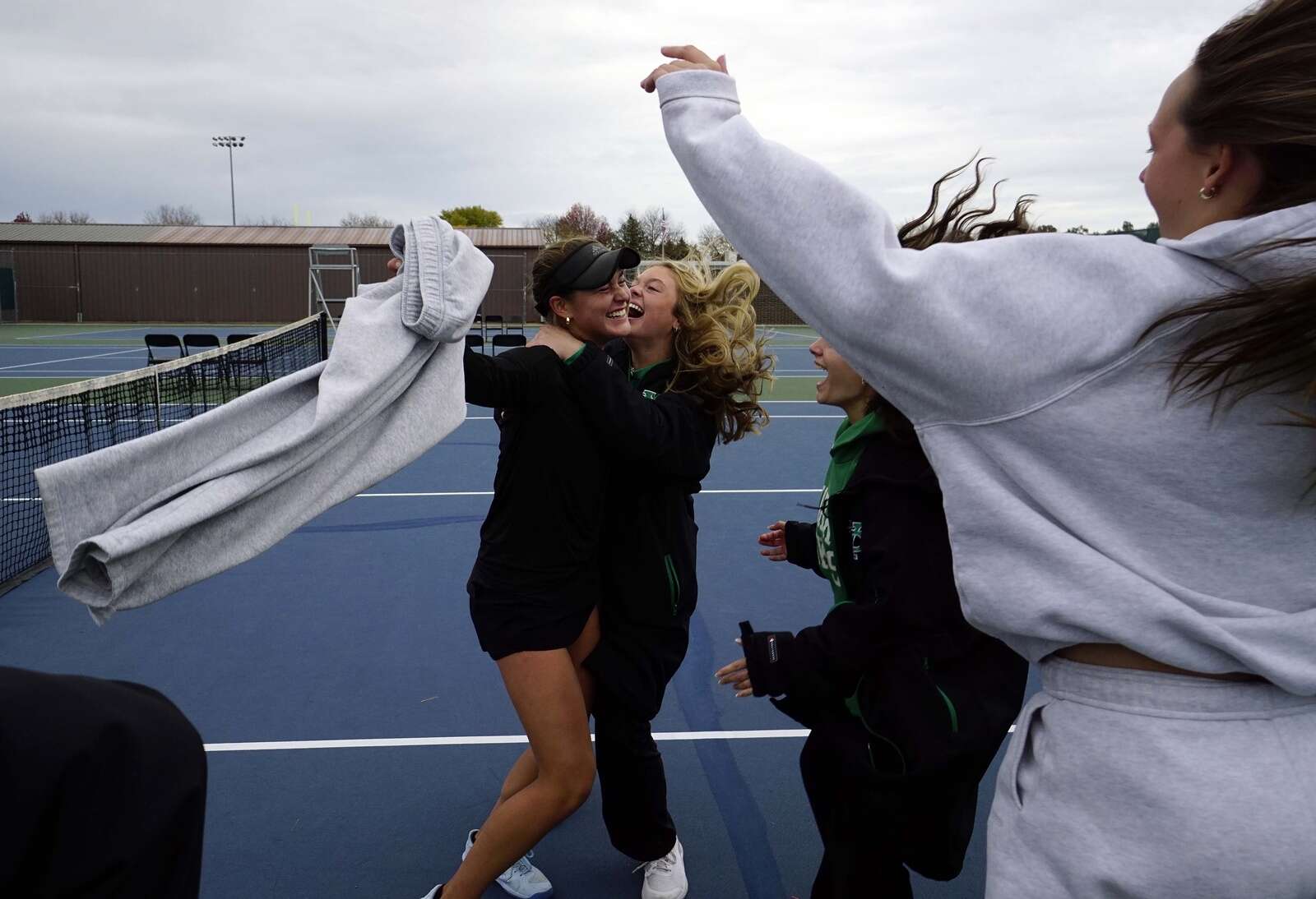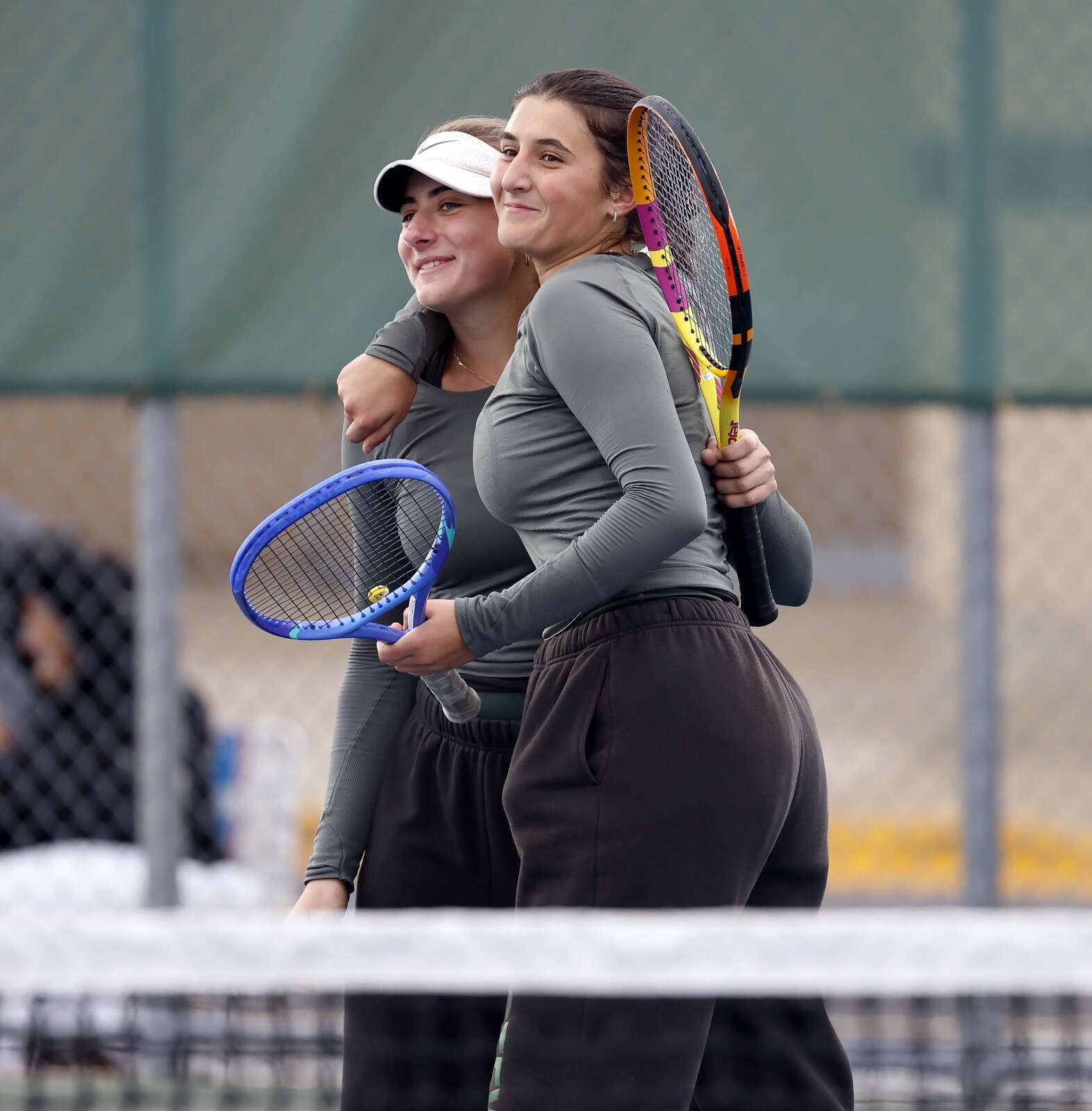 After match point, the sisters — fifth at state in doubles a year ago — shared a lengthy embrace in a service box and swayed together for a few fun seconds before shaking hands with the Red Devils.
