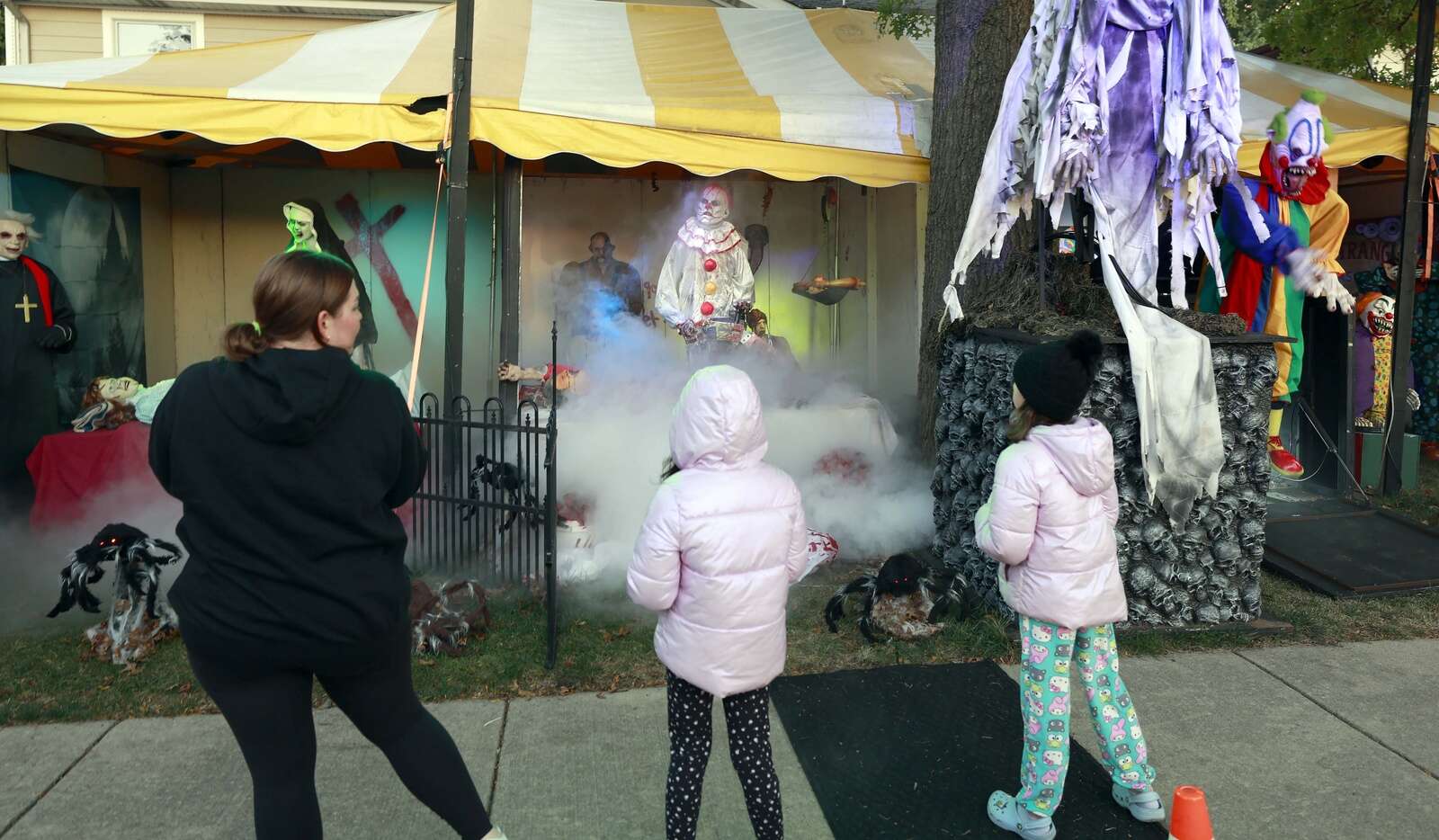A family stops to look at the Schiffer’s Halloween display in Downers Grove. The Schiffers have been putting on their elaborate Halloween display for 14 years. Brian Hill/bhill@dailyherald.com