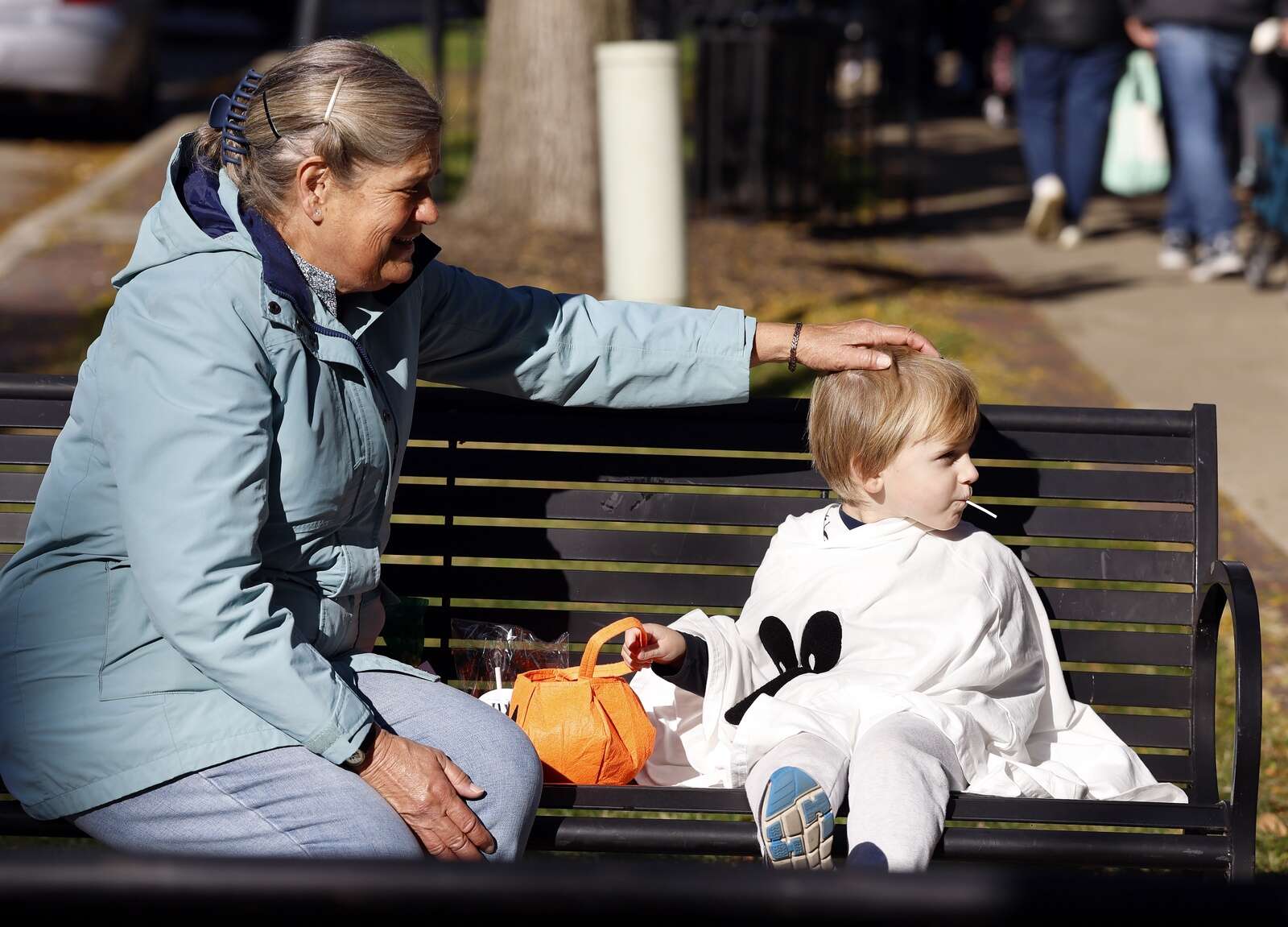 Joyce Elliott of Geneva takes a rest with grandson Emmett Elliott, 3, of Warrenville as he enjoys some of his rewards from trick-or-treating in Geneva.