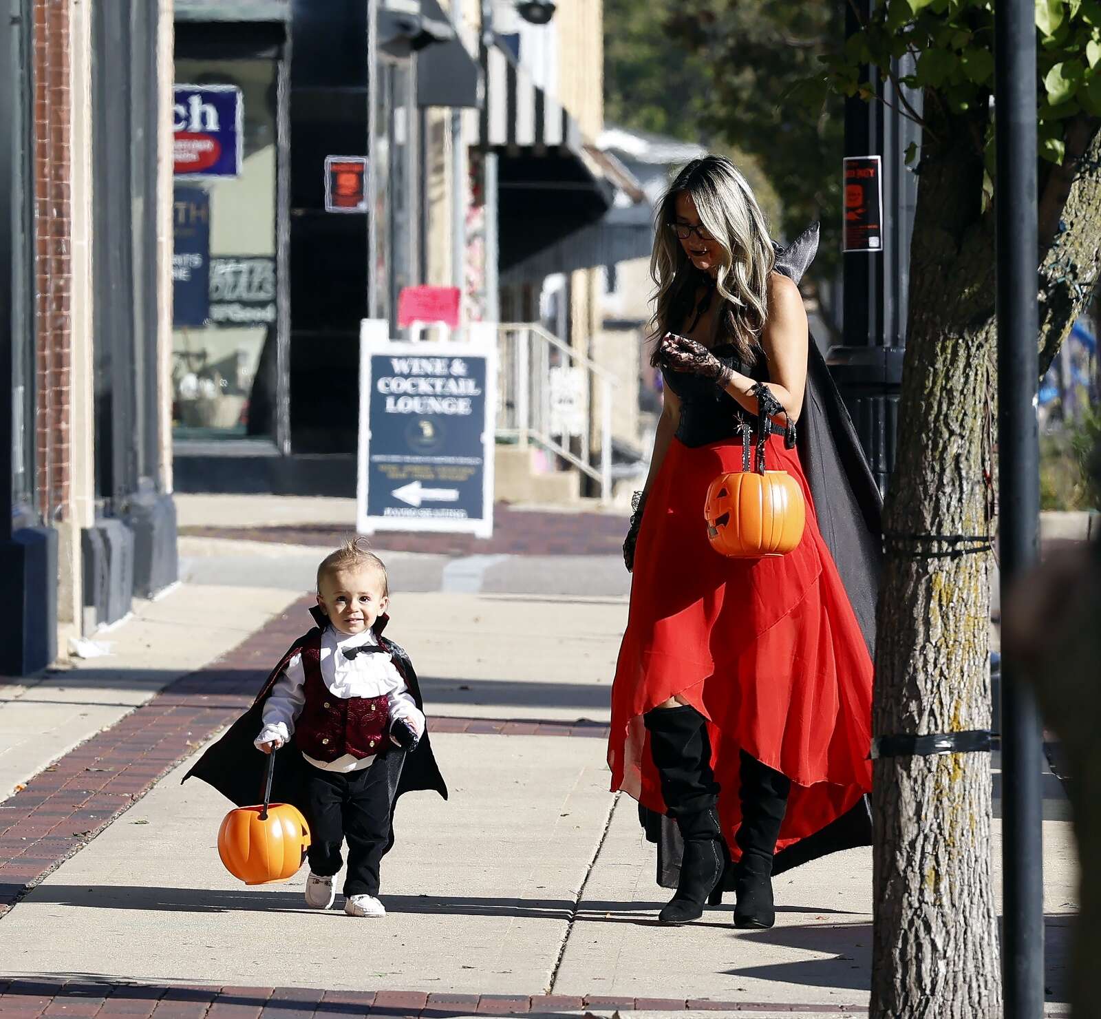 Dressed as skeletons, Krista Whitehair and her son Max Witek, both of Geneva, are ready for some candy as they trick-or-treat in downtown Geneva.