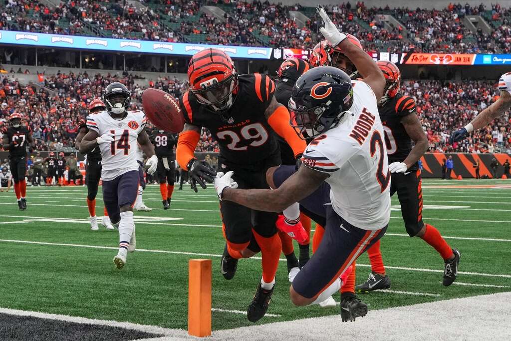 3. Sleepy “D”: Receiver Tee Higgins’ off-balance, deft, sideline catch over cornerback Nahshon Wright went for a 44-yard touchdown with 1:12 left in the half and put the Bengals up 20-17. The scoring drive took only two plays and 17 seconds after the Bears couldn’t put the ball in the end zone and settled for a field goal. The defensive lapse was similar to the one the Bears had against New Orleans last month.