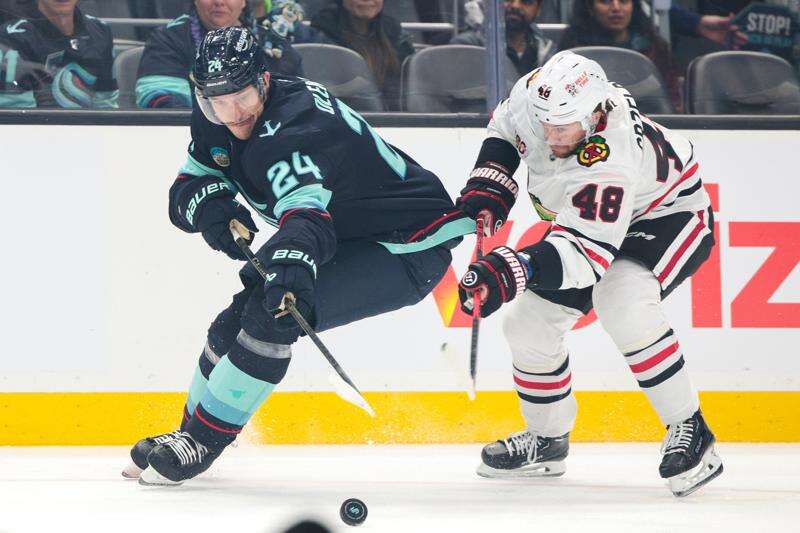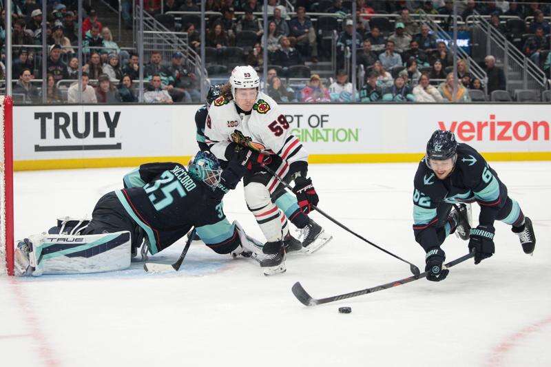 Following a tripping penalty by Blackhawks center Ryan Donato midway through the second period, Seattle scored its second goal of the game just 8 seconds into its first power play. Eberle saucered a backhand pass to Beniers in the slot, and the Kraken forward finished it off for his second goal of the season.