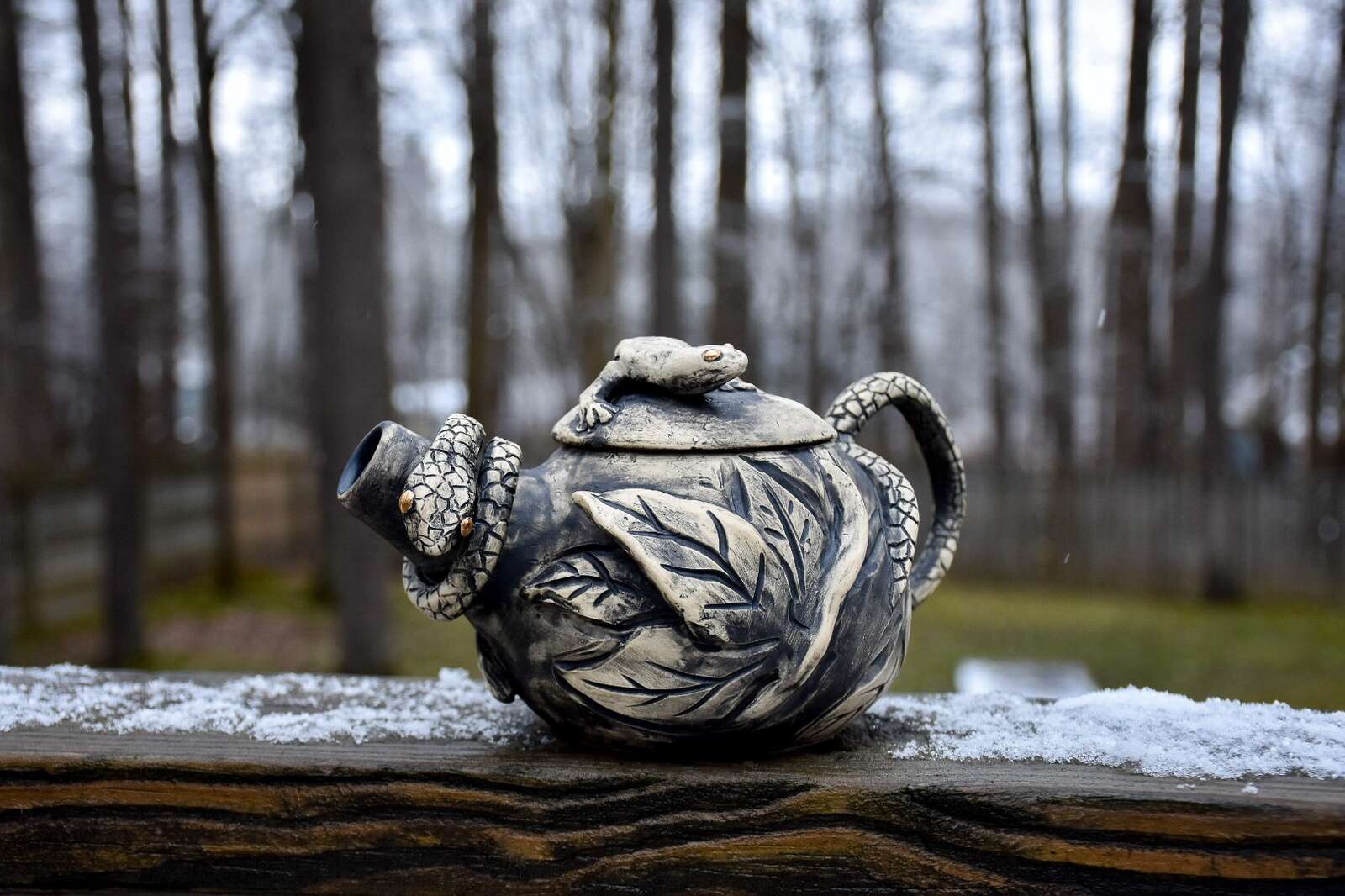 Nancy Greenleaf from Pennsylvania has two pieces in the show. Her first piece, “Creekbed Teapot: Snaked,” is a hand-sculpted stoneware teapot featuring a snake handle and a salamander lid.